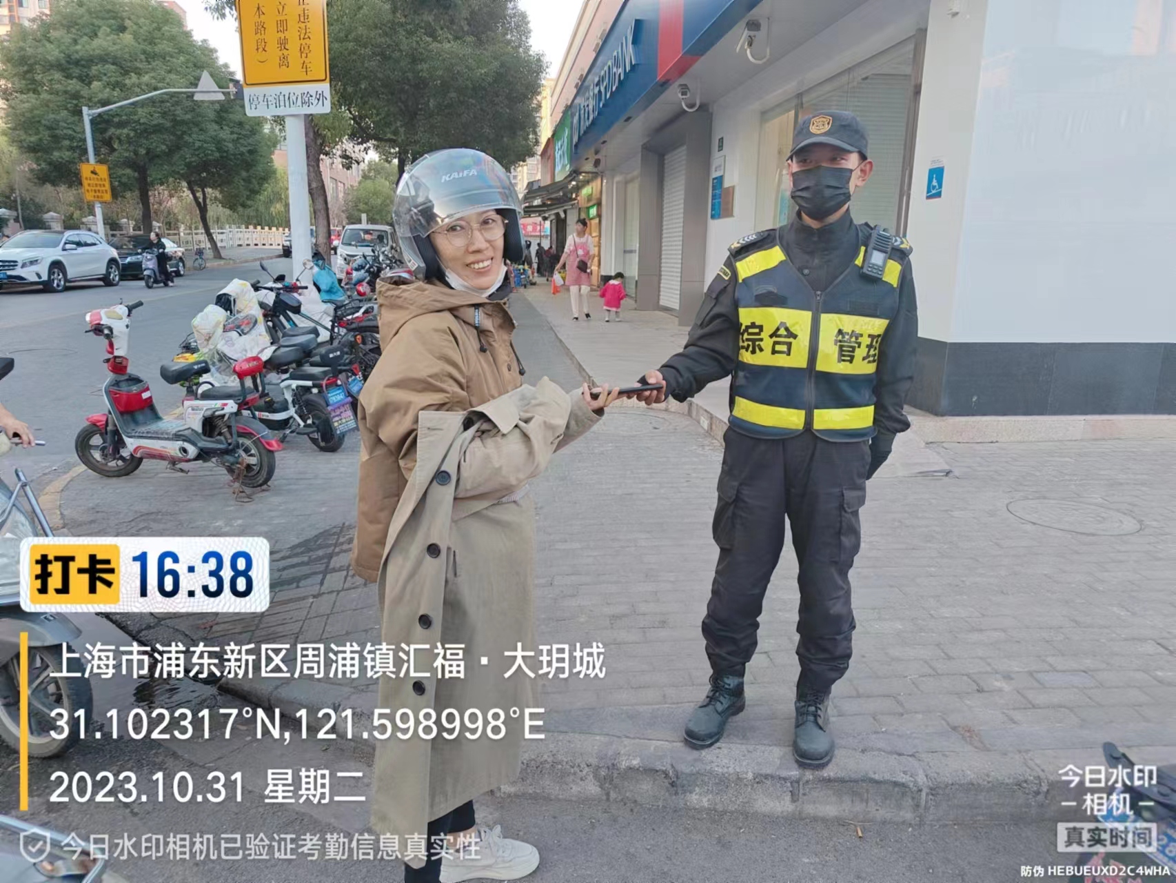 10月28日14:40,宗保公司駐浦東新區(qū)蘆潮港市容項目員工滿其安在港輝路與蘆云路紅綠燈交叉口巡查時,撿到一部華為手機(jī)。滿其安詢問周圍人員無果后,將情況報告了帶班組長,并留在原地等待。大概過了20分鐘,一男子打來電話尋找手機(jī),滿其安詢問了手機(jī)的顏色、品牌,便與他約定好碰面地點。很快,一位男子急匆匆地趕到約定地點,滿其安核對好手機(jī)型號、顏色、鎖屏密碼等信息,確認(rèn)男子是失主后,就將手機(jī)交還給了他。