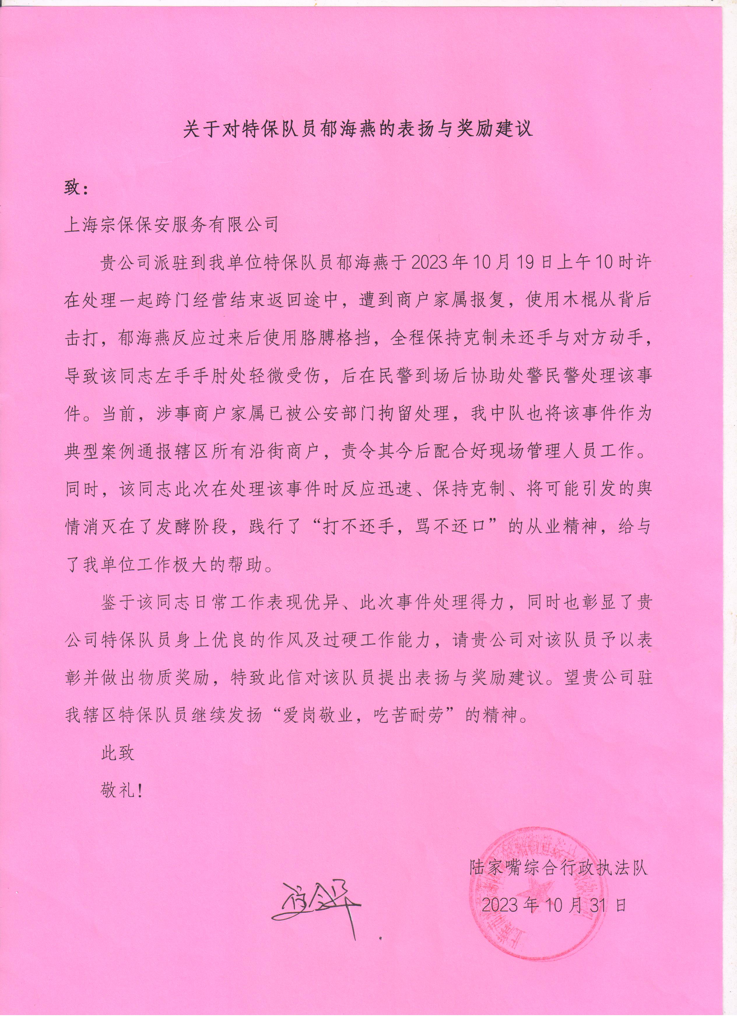 10月31日,宗保公司駐陸家嘴綜合行政執(zhí)法隊輔助項目收到陸家嘴綜合行政執(zhí)法隊的表揚信,信中表揚了公司員工郁海燕忍辱克制的優(yōu)秀表現(xiàn)。