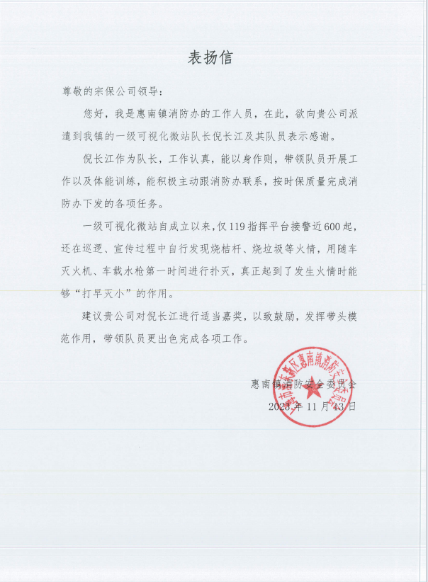 11月13日,宗保公司駐浦東新區(qū)惠南鎮(zhèn)消防辦輔助項目收到惠南鎮(zhèn)消防安全委員會的表揚信,信中對公司員工倪長江出色的工作表現(xiàn)給予表揚。