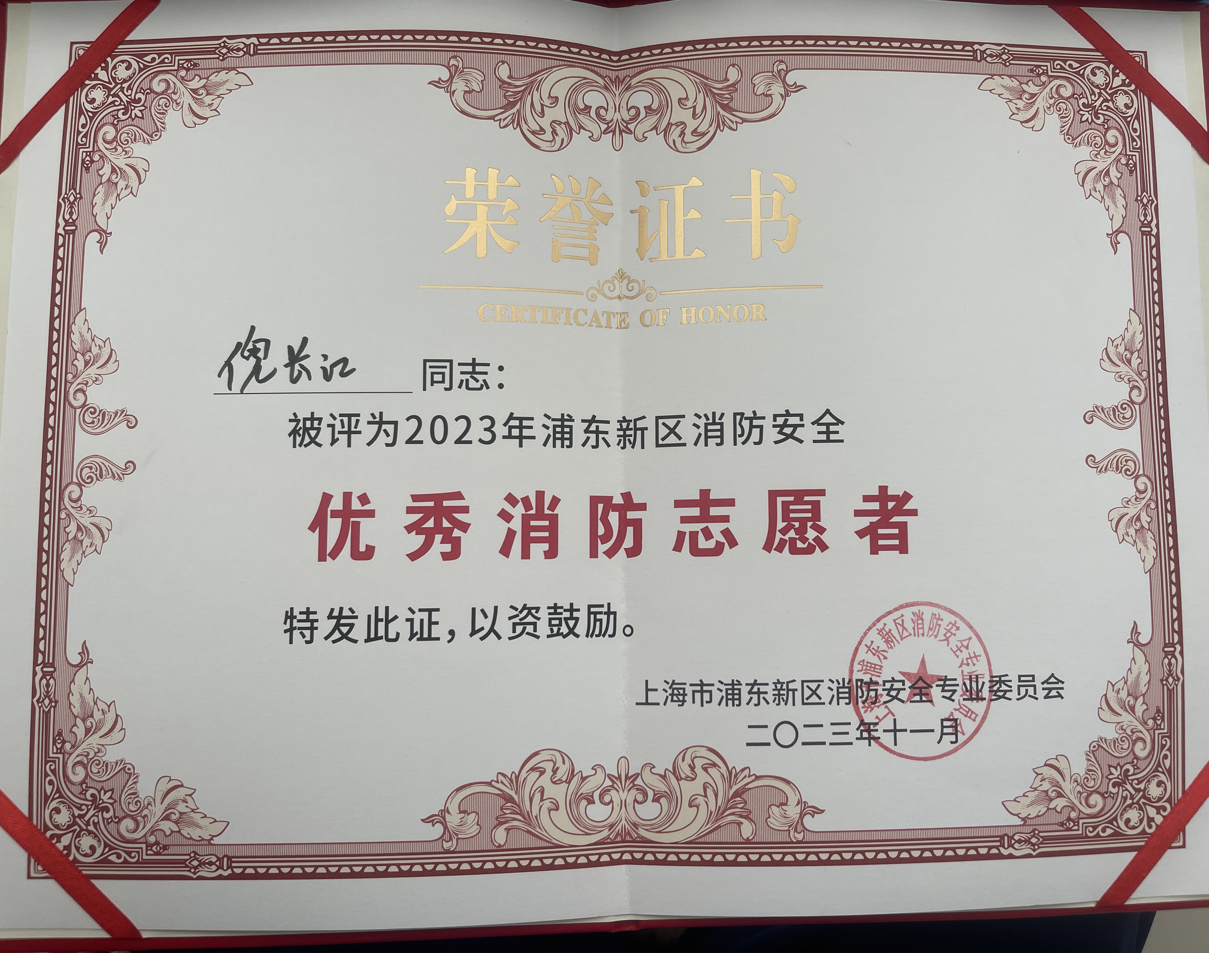 倪長江堅持踐行公司“服務至上”的經營發(fā)展理念,遵守消防操作工作規(guī)范,主動與消防辦溝通聯(lián)系,密切進行協(xié)同配合,努力提高服務保障質效,出色地完成了消防辦賦予的各項工作任務,并因工作出色被上海市浦東新區(qū)消防安全專業(yè)委員會評為“2023年浦東新區(qū)消防安全優(yōu)秀消防志愿者”。