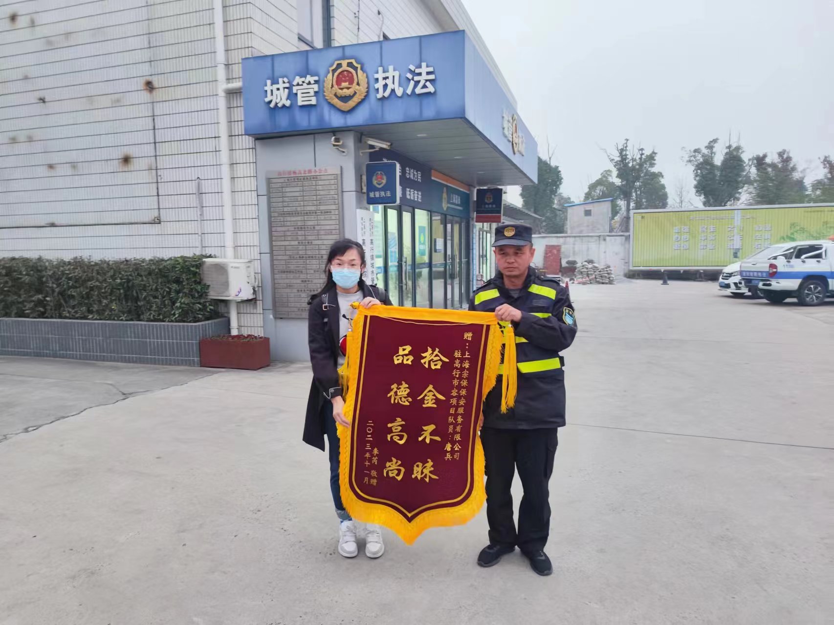 11月24日,市民李女士將一面繡有“拾金不昧 品德高尚”的錦旗贈(zèng)送給宗保公司駐浦東新區(qū)高行市容項(xiàng)目員工唐兵,感謝他拾金不昧的行為。