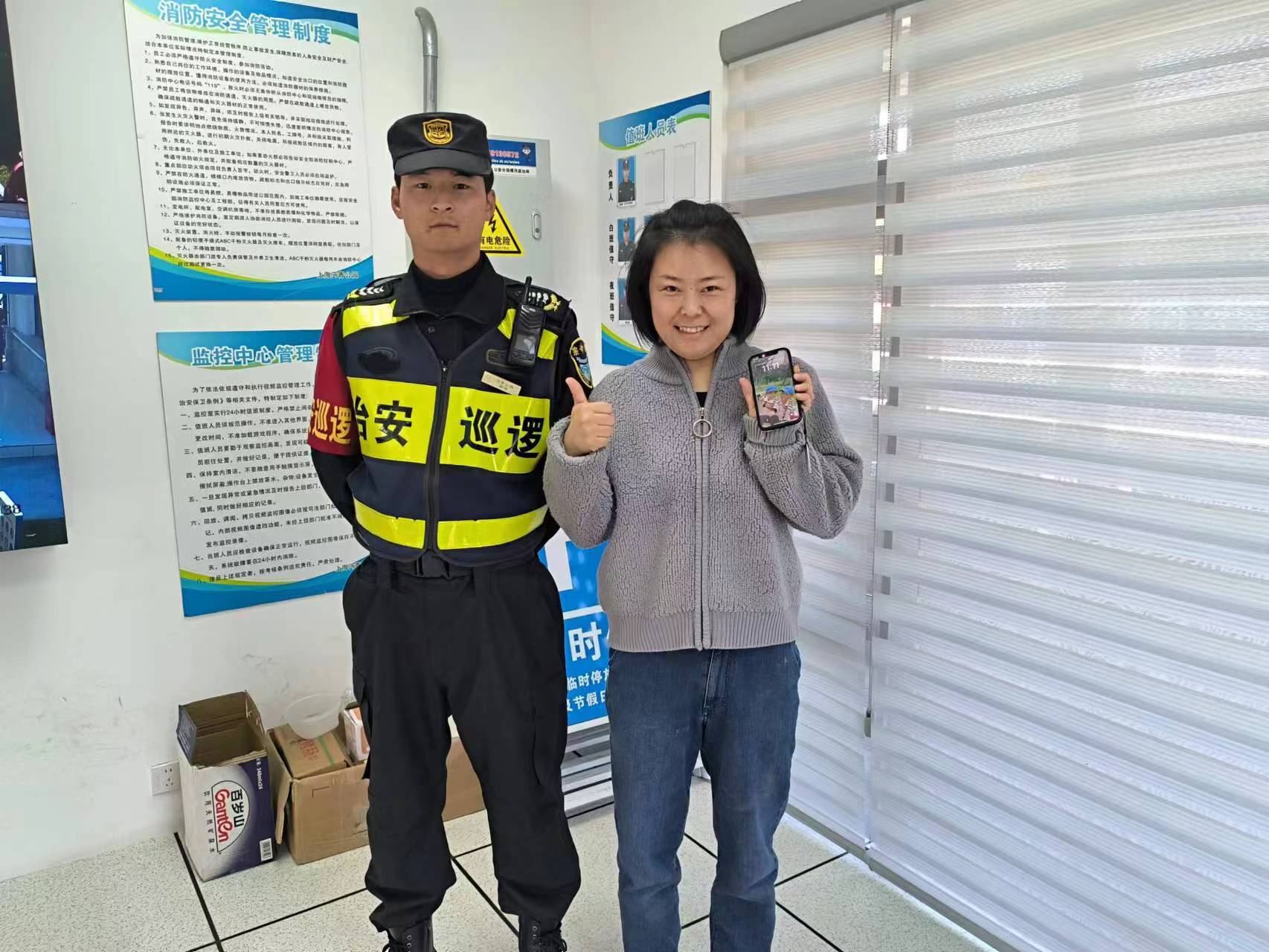 11月21日11:00,宗保公司駐浦東新區(qū)沔青公園員工王飛帆在值勤時(shí),撿到一部蘋(píng)果手機(jī),隨即將情況報(bào)告了帶隊(duì)隊(duì)長(zhǎng),并按指示將手機(jī)送到公園監(jiān)控室。同時(shí),王飛帆將撿到手機(jī)的消息發(fā)布在工作群,請(qǐng)?jiān)趰徫恢登诘耐聨兔α粢馐е鳌4蟾胚^(guò)了十幾分鐘,同事孫克看到一位女士邊走邊看,像在尋找什么東西,便主動(dòng)上前詢(xún)問(wèn)。女士說(shuō)自己的手機(jī)在公園掉了,孫克詢(xún)問(wèn)了女士手機(jī)的品牌、顏色等信息,隨后告訴女士到公園監(jiān)控室認(rèn)領(lǐng)。該女士很快趕到監(jiān)控室,成功解鎖手機(jī)密碼確認(rèn)其是失主后,等在監(jiān)控室的王飛帆將手機(jī)交還給了她。女士拿到手機(jī)很高興,連連向宗保員工王飛帆道謝。