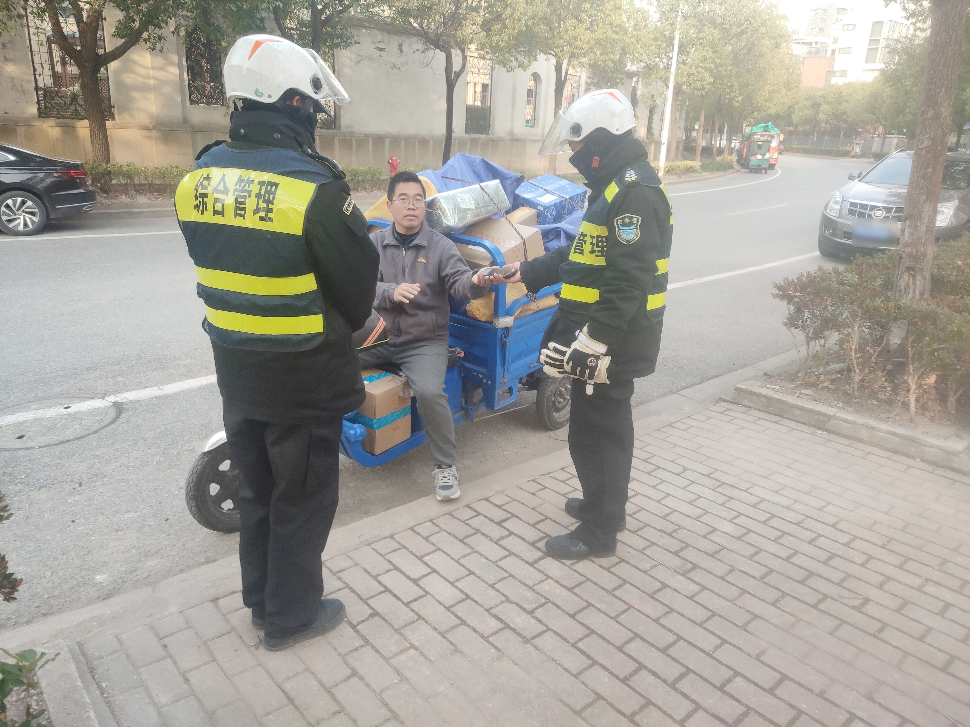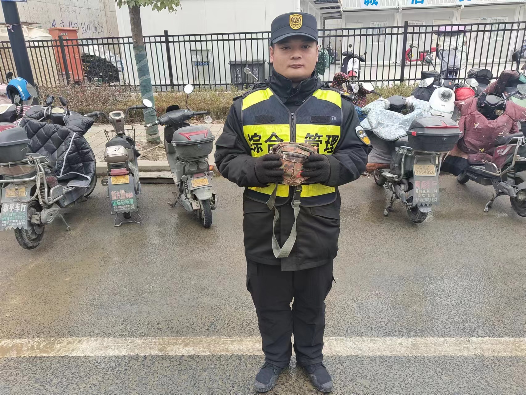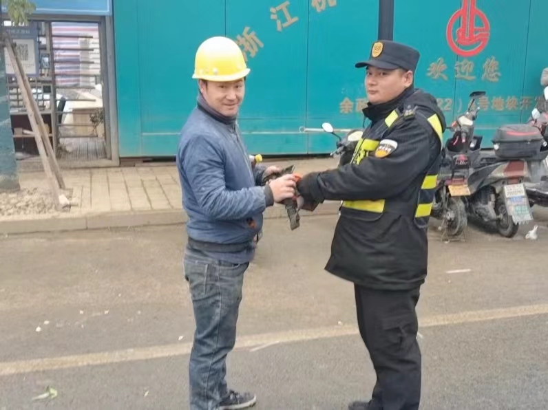 1月8日11:00,浙江民泰公司駐杭州市余杭區(qū)閑林城管輔助項(xiàng)目員工明宗梁和楊顯峰在民聚福路杭州灣工地門(mén)口協(xié)助甲方開(kāi)展無(wú)證攤販管理時(shí),撿到一個(gè)挎包,內(nèi)有一部手機(jī)、一張身份證和一副耳機(jī)。明宗梁隨即詢(xún)問(wèn)周?chē)と?,是否有人丟挎包,結(jié)果無(wú)人認(rèn)領(lǐng)。楊顯峰就將情況報(bào)告了隊(duì)長(zhǎng),并按指示在原地等待。大約過(guò)了10幾分鐘,一名男子急匆匆地趕到現(xiàn)場(chǎng),詢(xún)問(wèn)是否看到一只挎包。明宗梁仔細(xì)向男子核對(duì)了包內(nèi)物品,確認(rèn)其是失主后,便把挎包交還給了他。男子拿著挎包,再三向員工明宗梁和楊顯峰道謝。