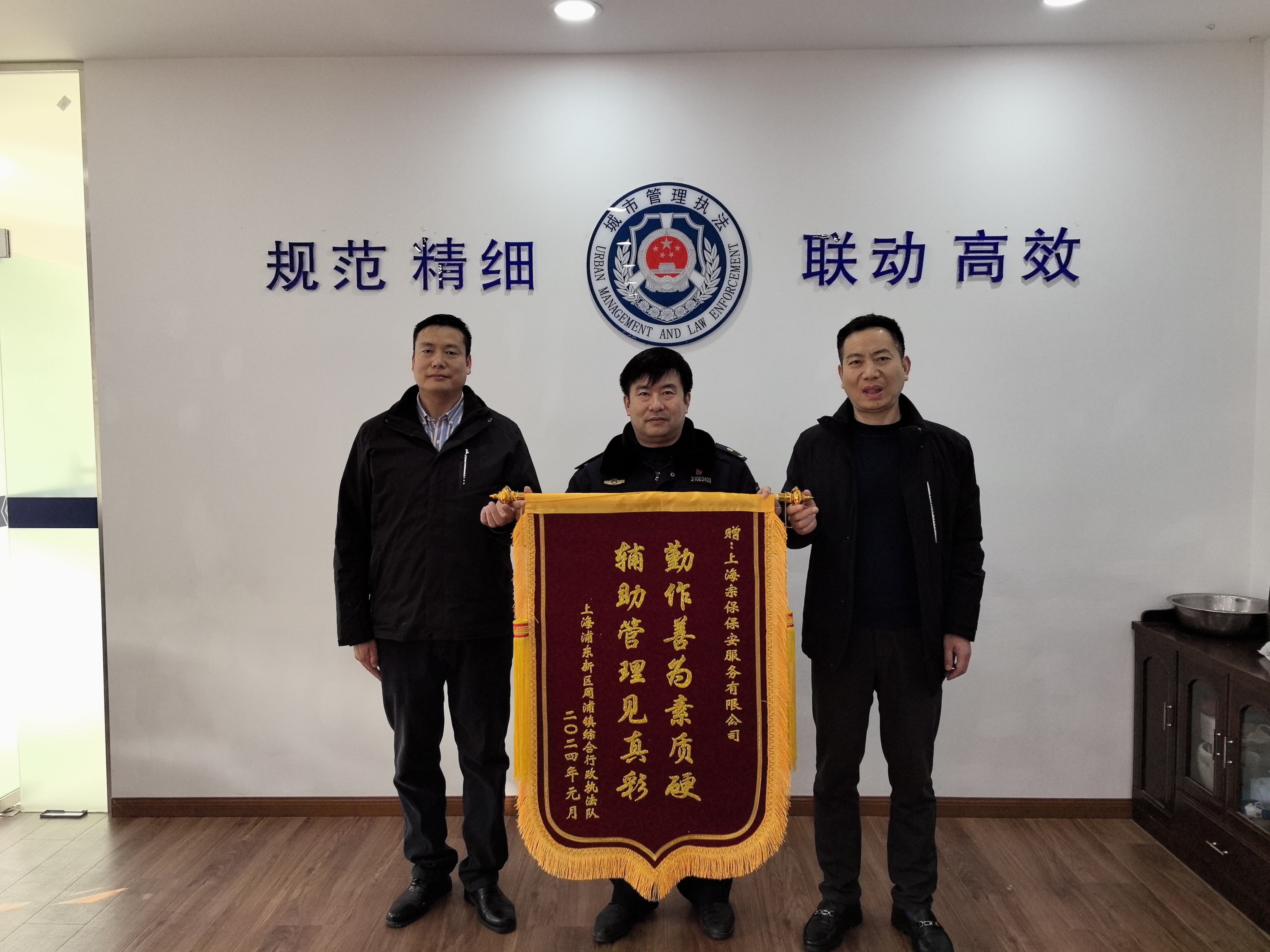 1月9日,宗保公司收到浦東新區(qū)周浦鎮(zhèn)綜合行政執(zhí)法隊贈送的繡有“勤作善為素質(zhì)硬 輔助管理見真彩”的錦旗,充分肯定公司駐周浦鎮(zhèn)城管輔助項目員工履職盡責(zé)、積極作為的出色表現(xiàn),贊揚公司項目員工全力以赴協(xié)助執(zhí)法隊開展鎮(zhèn)容環(huán)境整治,為營造干凈、整潔、有序的鎮(zhèn)域環(huán)境作出的積極努力。