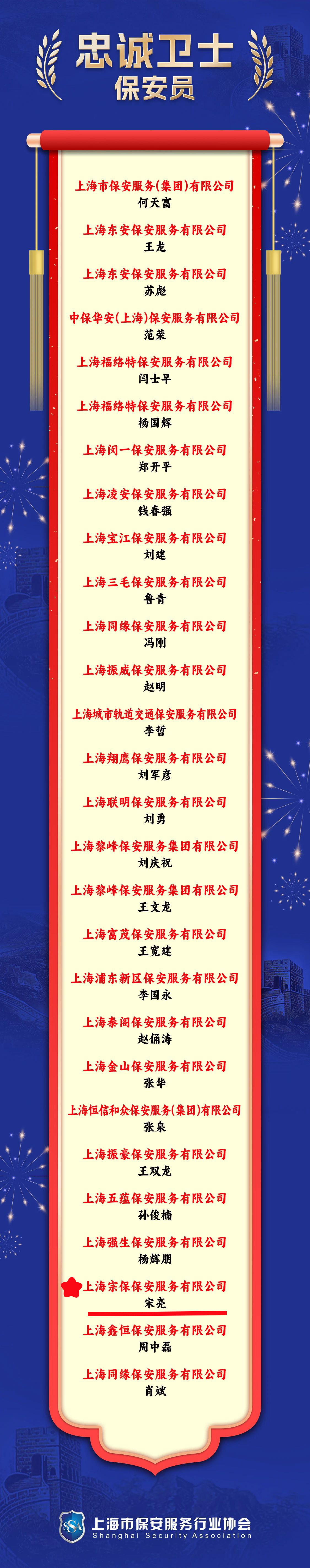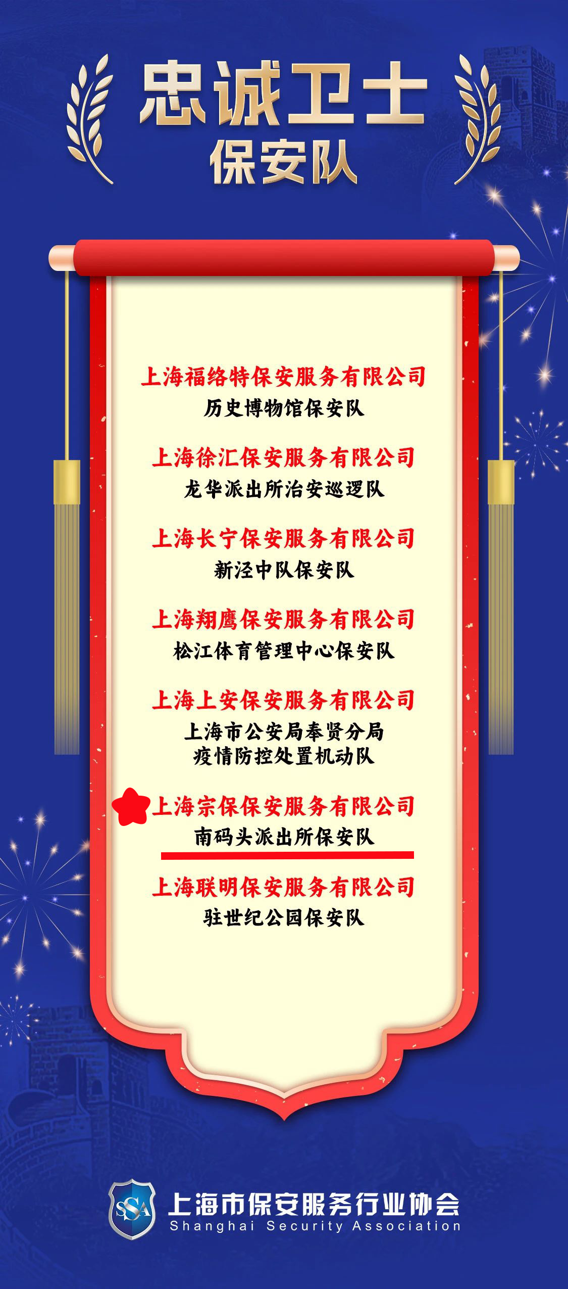 近日,上海市保安服務行業(yè)協(xié)會公布了2023年度“忠誠衛(wèi)士”評選結果,宗保公司1個保安隊和1名員工分獲殊榮。