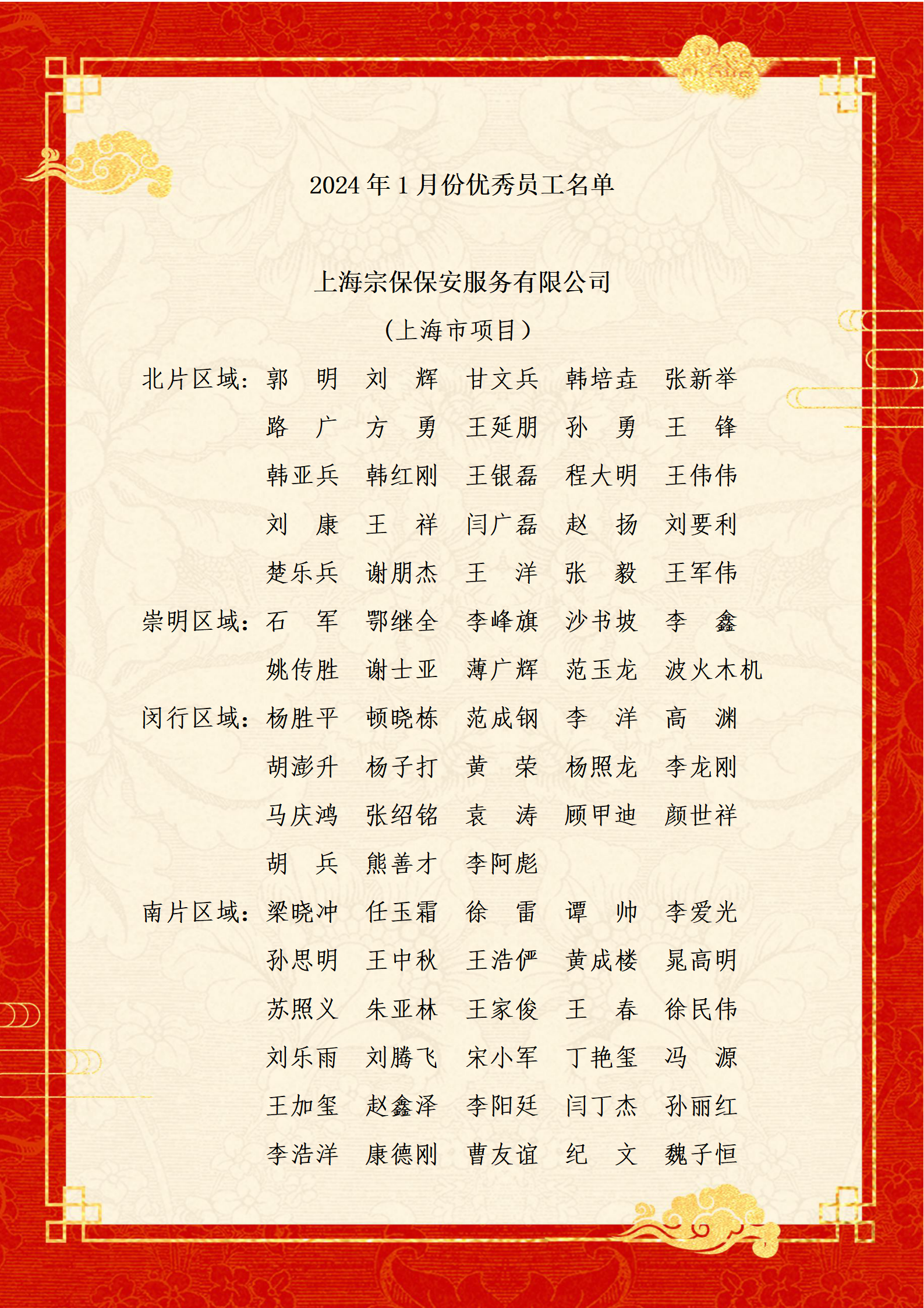 1月份,公司廣大員工根據(jù)甲方的任務(wù)要求,按照公司的部署安排,積極踐行公司“誠信為本 服務(wù)至上”的經(jīng)營理念,持續(xù)發(fā)揚擔(dān)當盡責(zé)、善作善為的工作作風(fēng),助力完成了元旦小長假南京歡樂谷安保秩序維護、浦東祝橋鎮(zhèn)2024年產(chǎn)業(yè)項目重點工程民生實事項目集中開工儀式等多個大型活動臨時保障任務(wù),全力配合甲方做好了城市管理輔助、治安巡邏聯(lián)防、物業(yè)服務(wù)保障、生態(tài)環(huán)境保護、高鐵線路巡防等工作。期間,涌現(xiàn)出了一批盡心履責(zé)、崗位建功、拾金不昧、熱心助人的優(yōu)秀員工和先進典型。