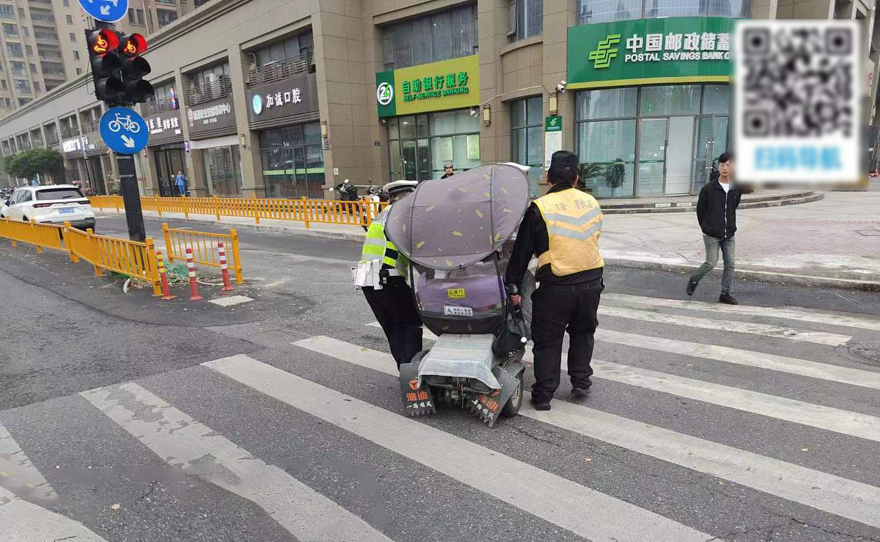 當(dāng)日17:30,公司員工武旭在東湖北路超峰東路路口執(zhí)勤時,看到一輛電動代步車停在馬路中間,便趕緊上前詢問。原來,駕駛員是一名腿腳不便的女士,代步車突發(fā)狀況壞在路上,女士正焦急地不知該怎么辦。
