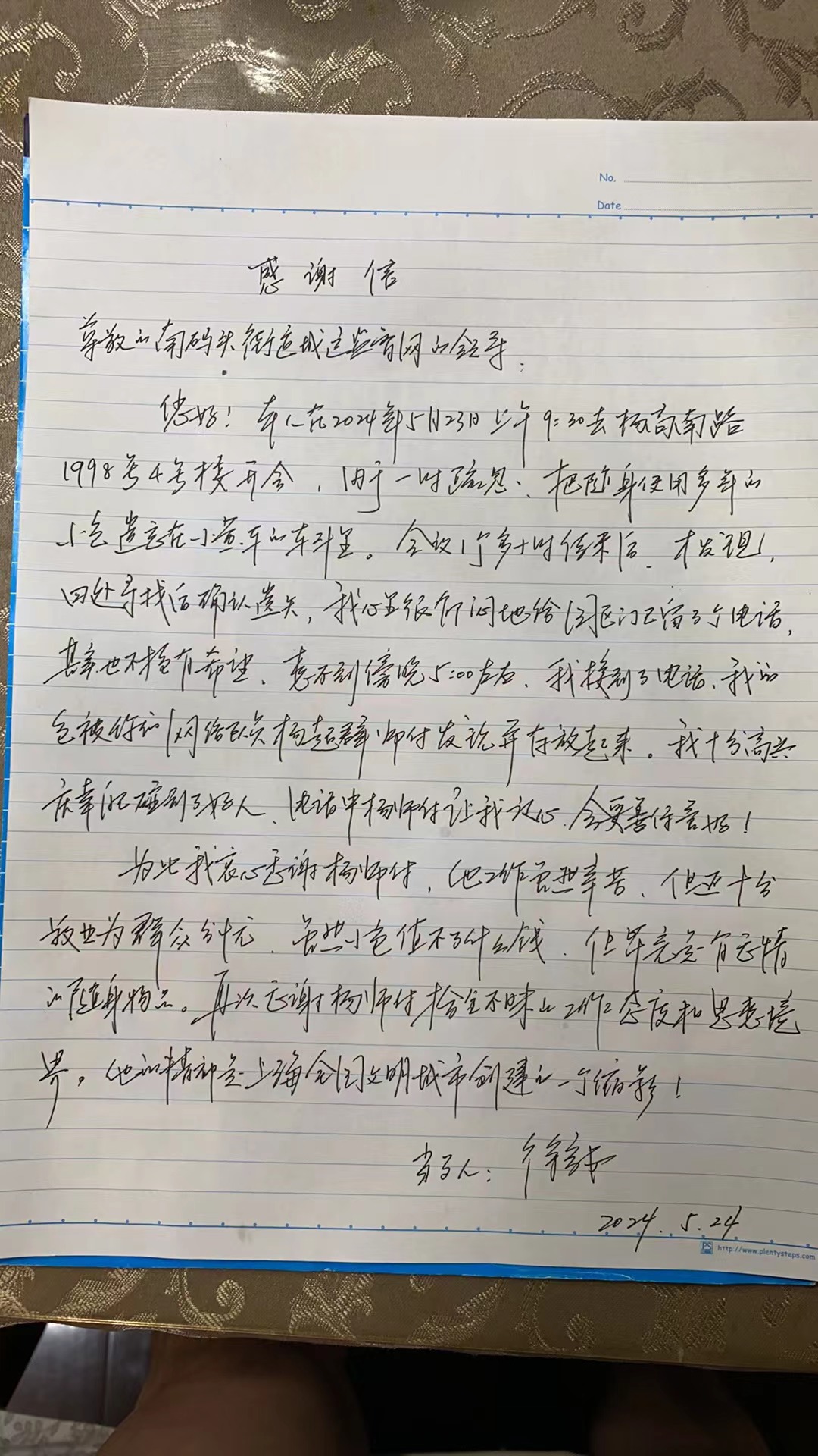 失主很快趕到南碼頭城運(yùn)中心領(lǐng)回了自己的包,并于次日特意送來(lái)一封感謝信,表?yè)P(yáng)宗保公司員工楊召群拾金不昧的助人行為。