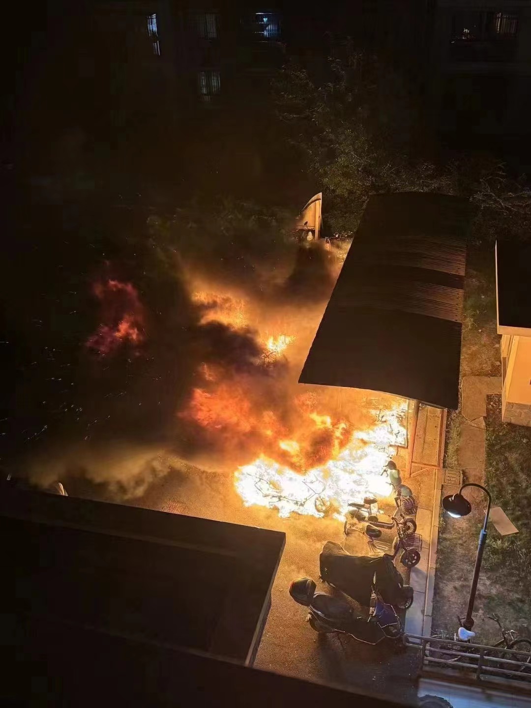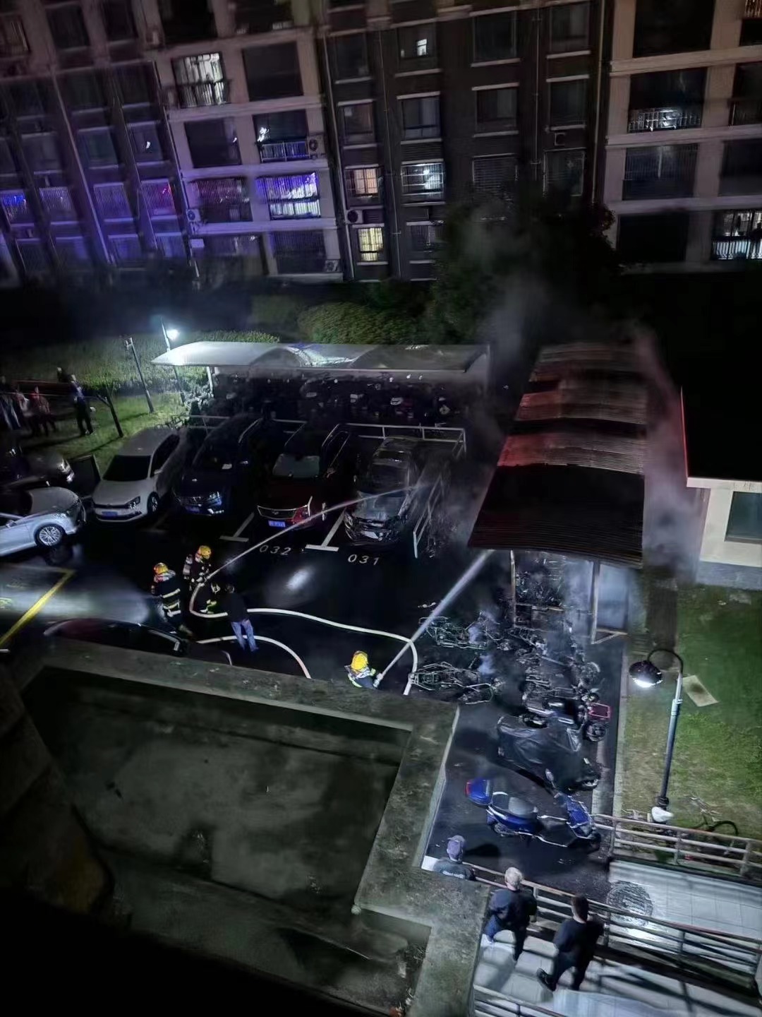 兩人火速趕到現(xiàn)場(chǎng),發(fā)現(xiàn)車棚內(nèi)多輛電動(dòng)自行車正在猛烈燃燒,火勢(shì)較大濃煙滾滾,同時(shí)還夾雜著噼噼啪啪的聲音,更為嚴(yán)重的是車棚旁還停放著5輛汽車,火勢(shì)如得不到及時(shí)有效控制,不但會(huì)造成巨大的財(cái)產(chǎn)損失,而且還會(huì)威脅到小區(qū)居民的生命安全。
