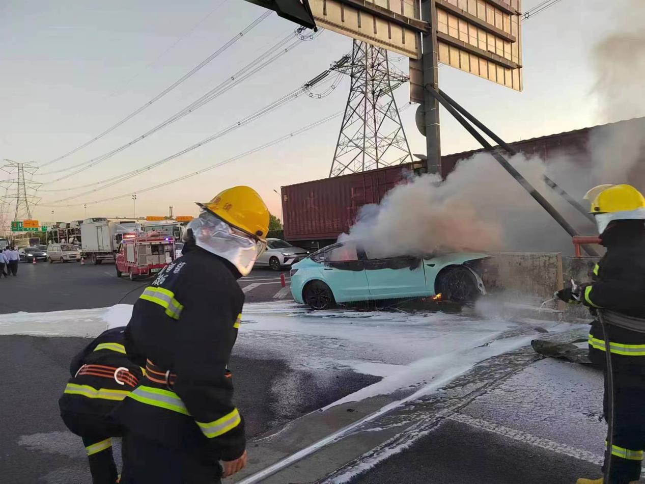 當(dāng)日18:20,公司員工朱光海在微型消防站值班時(shí),突然聽到S2滬蘆高速康橋收費(fèi)站附近傳來一聲巨響。朱光海敏銳地察覺到異常情況后,便立即循著聲音的方向跑去,發(fā)現(xiàn)收費(fèi)站出口處一輛新能源轎車發(fā)生事故起火。
