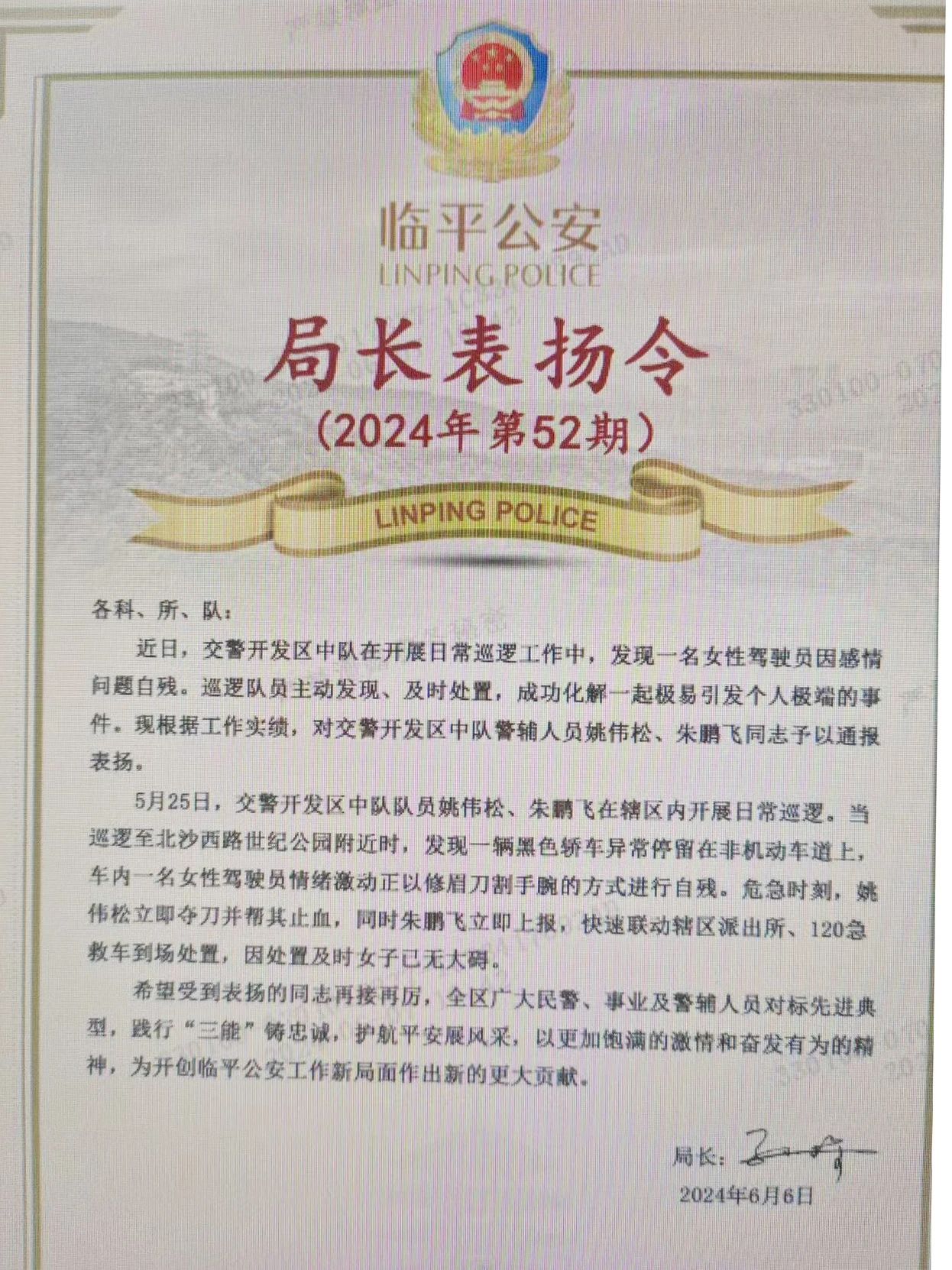 6月6日,浙江民泰公司駐杭州市臨平區(qū)公安分局東湖交管輔助項目收到分局孫琦局長簽發(fā)的2024年第52期《局長表揚令》,對公司員工朱鵬飛協(xié)助勸阻割腕女青年,成功化解一起極端事件的出色表現(xiàn)給予表揚。