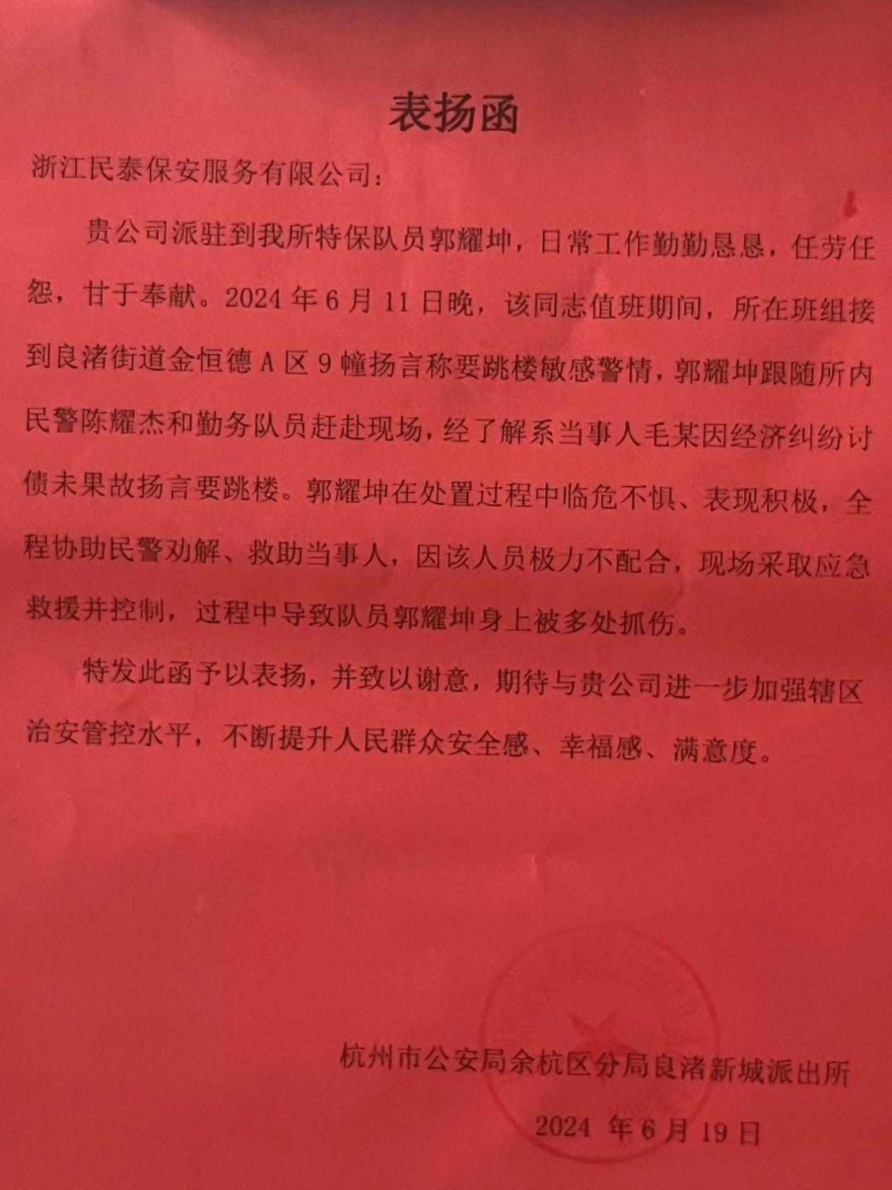 6月19日,浙江民泰公司駐杭州市余杭區(qū)公安分局良渚新城派出所輔助項目員工郭耀坤收到良渚新城派出所的一封表揚信,信中對他在輔助執(zhí)法過程中面對當事人的推搡抓挖,打不還手、規(guī)范執(zhí)法、自律克制的行為給予表揚。
