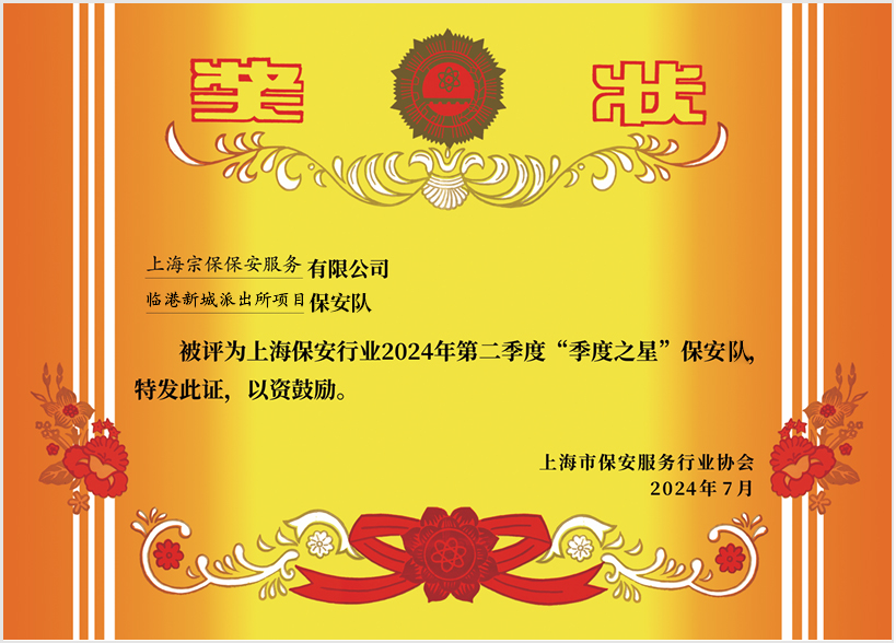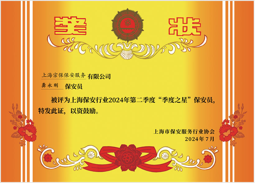 活動(dòng)當(dāng)日,上海市保安服務(wù)行業(yè)協(xié)會(huì)對(duì)榮獲2024年第二季度“季度之星”保安隊(duì)和保安員稱號(hào)的獲獎(jiǎng)代表進(jìn)行了表彰。宗保公司駐浦東新區(qū)臨港新城派出所項(xiàng)目保安隊(duì)榮獲“季度之星”保安隊(duì)榮譽(yù)稱號(hào),公司員工龔永剛、王飛榮獲“季度之星”保安員榮譽(yù)稱號(hào)。