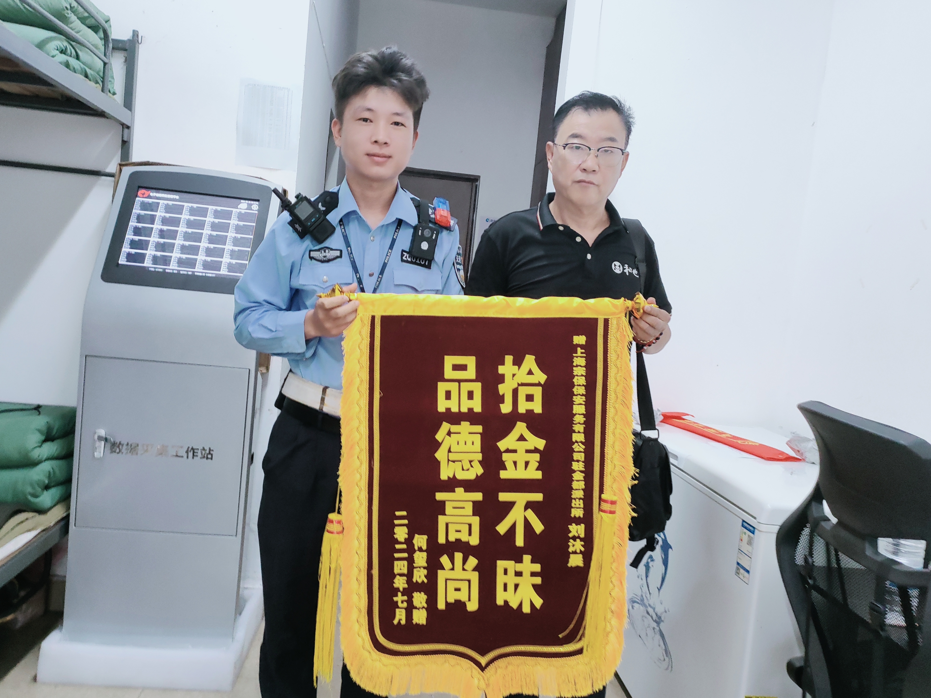 8月8日,宗保公司駐閔行區(qū)莘莊工業(yè)區(qū)項目員工收到市民何先生送來的一面繡有“拾金不昧 品德高尚”的錦旗,感謝公司員工劉沐晨受托將7800元現(xiàn)金等物品轉(zhuǎn)交給自己的熱心行為。