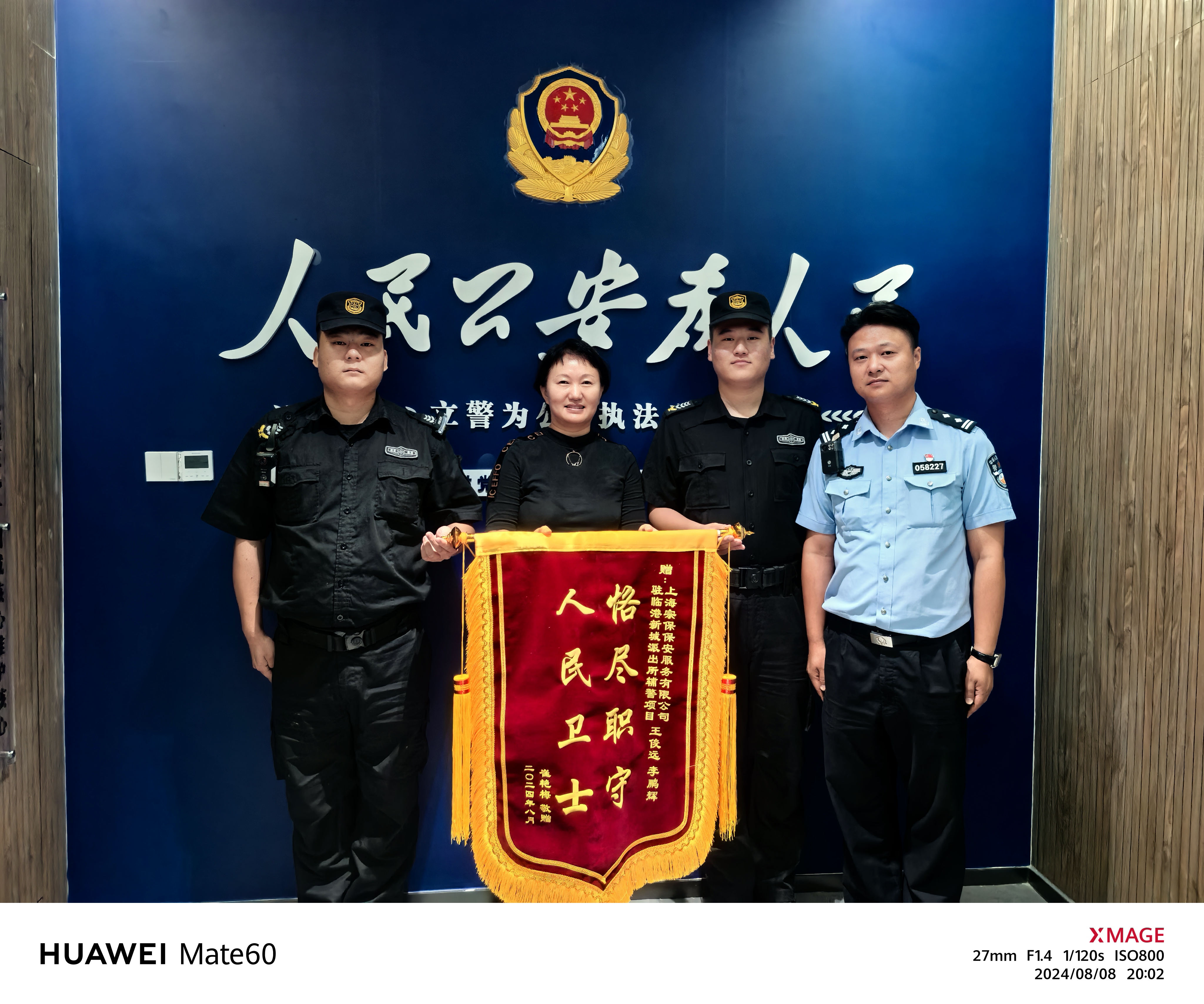 8月8日,宗保公司駐浦東新區(qū)臨港新城派出所輔助項目員工收到市民崔女士贈送的一面繡有“恪盡職守 人民衛(wèi)士”的錦旗,感謝公司員工王俊遠(yuǎn)和李鵬輝幫助其女兒張女士的擔(dān)當(dāng)助人行為。