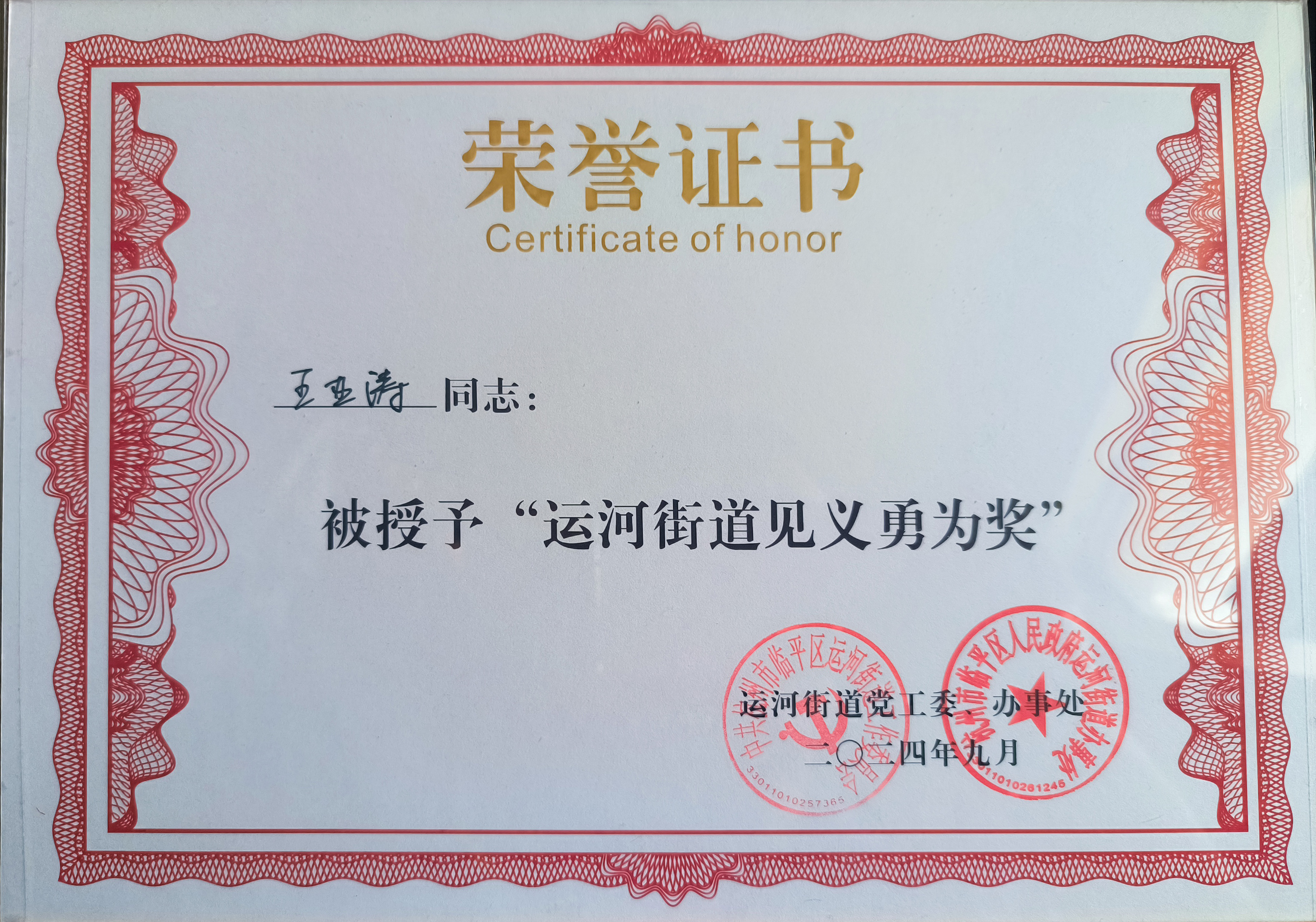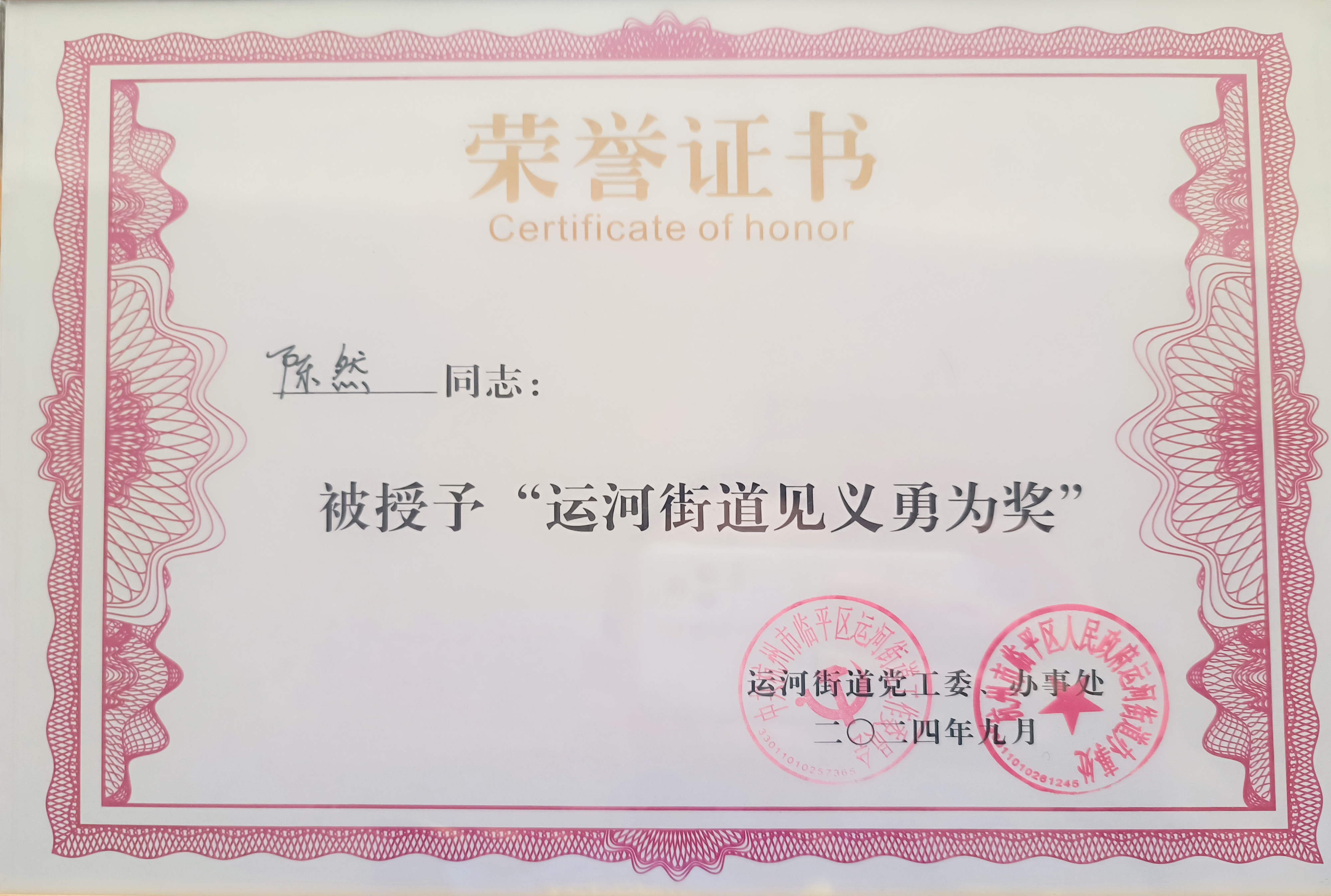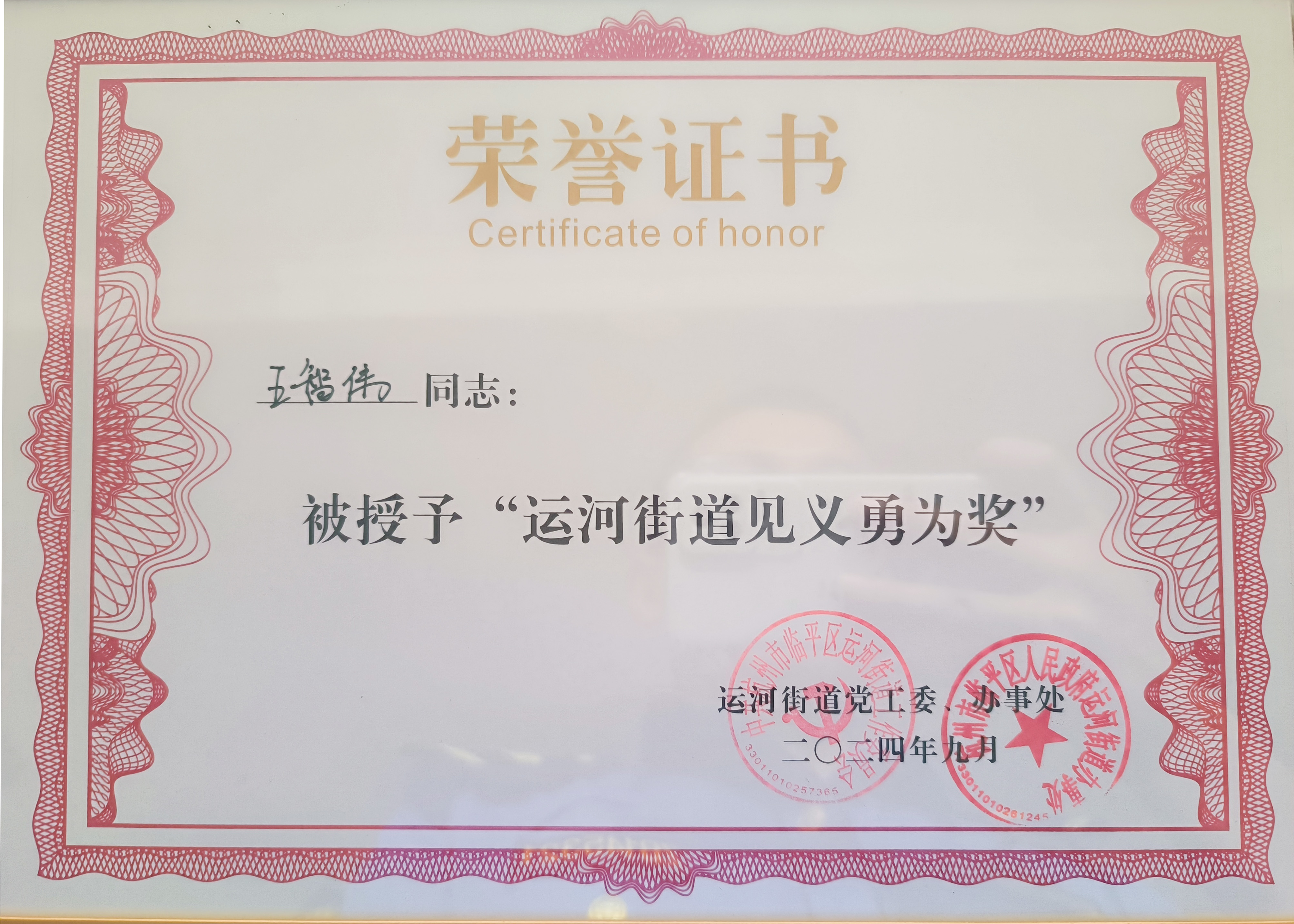 9月14日,浙江民泰公司駐杭州市臨平區(qū)運(yùn)河市容項(xiàng)目3名員工被運(yùn)河街道黨工委、辦事處授予“運(yùn)河街道見義勇為獎(jiǎng)”。