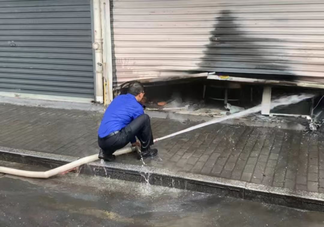3人見狀簡單交流后,便立即分工進(jìn)行滅火。王智偉引導(dǎo)疏散圍觀群眾,遠(yuǎn)離火場(chǎng)防止發(fā)生意外;陳然借來旁邊商鋪工具,奮力撬開商鋪卷閘門;而這時(shí)王亞濤已連接好消防水帶,拉近俯身對(duì)準(zhǔn)起火點(diǎn)持續(xù)噴水。火勢(shì)很快得到了控制,避免了菜市場(chǎng)商鋪更大的財(cái)產(chǎn)損失。