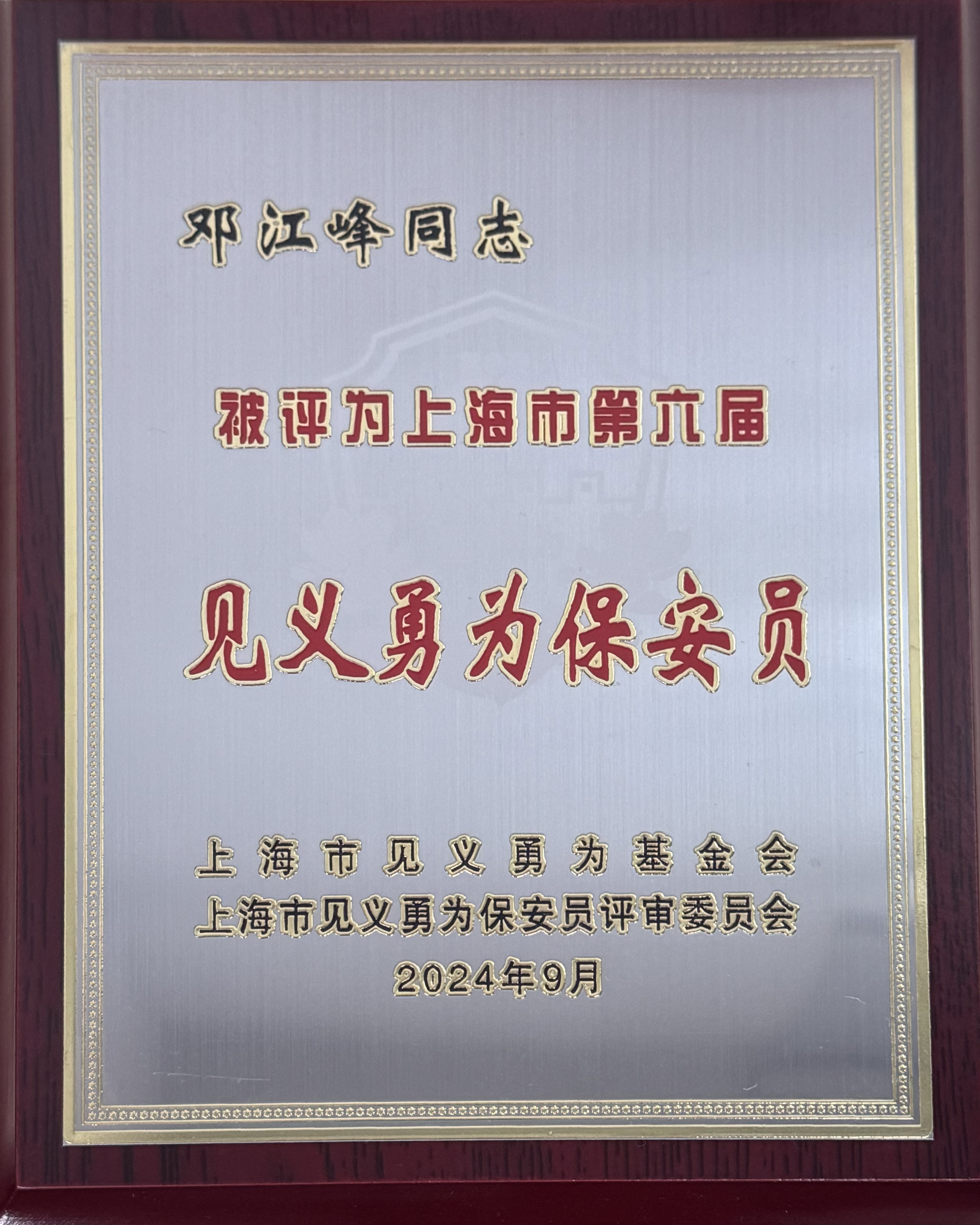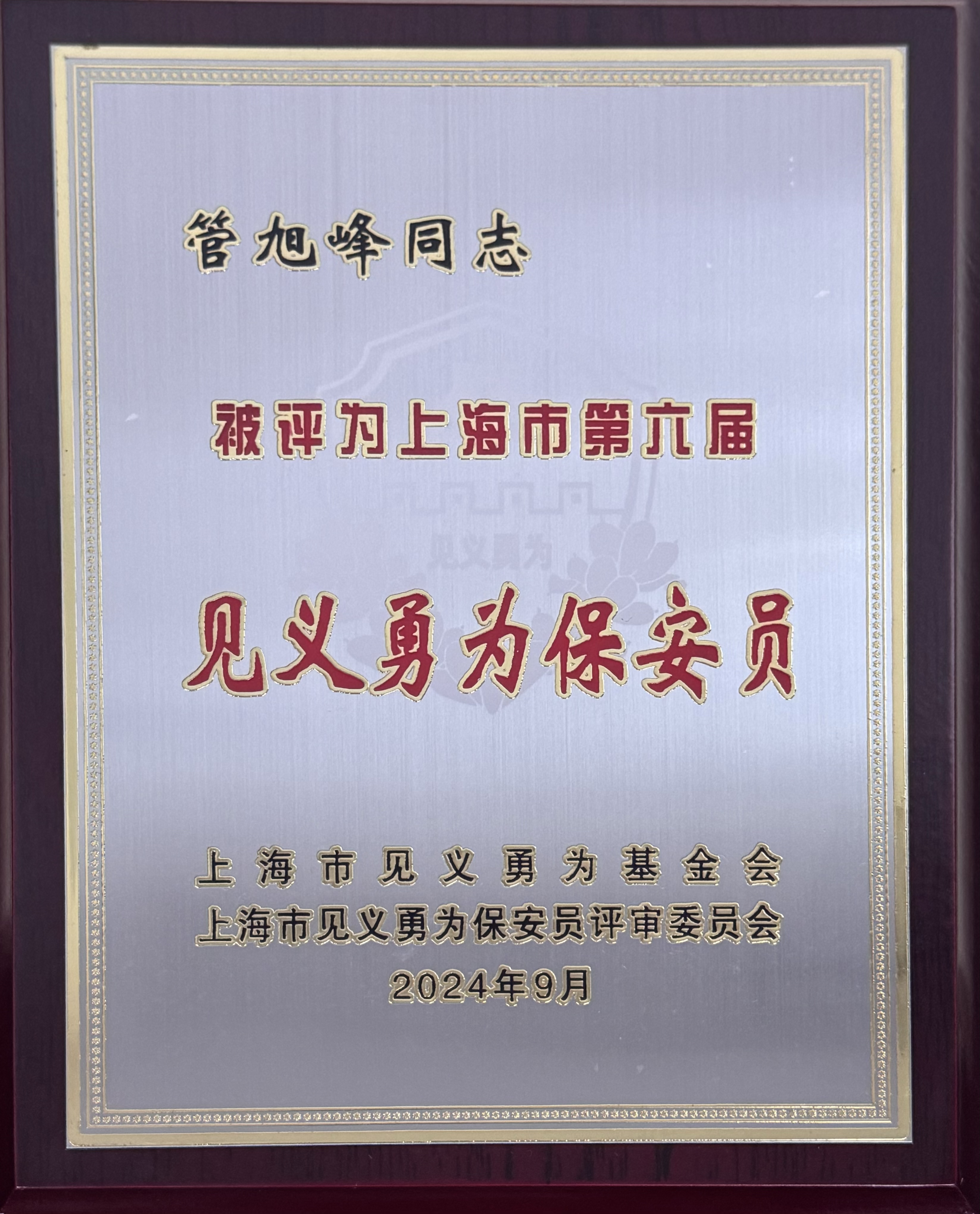 2024年9月27日,上海市見(jiàn)義勇為基金會(huì)在上海市司法局三樓會(huì)議室召開(kāi)2024年二三季度見(jiàn)義勇為先進(jìn)評(píng)選表彰發(fā)布會(huì)。會(huì)上,上海宗保保安服務(wù)有限公司員工管旭峰、凌邵凱、吳寶和鄧江峰被評(píng)為上海市第六屆“見(jiàn)義勇為保安員”。