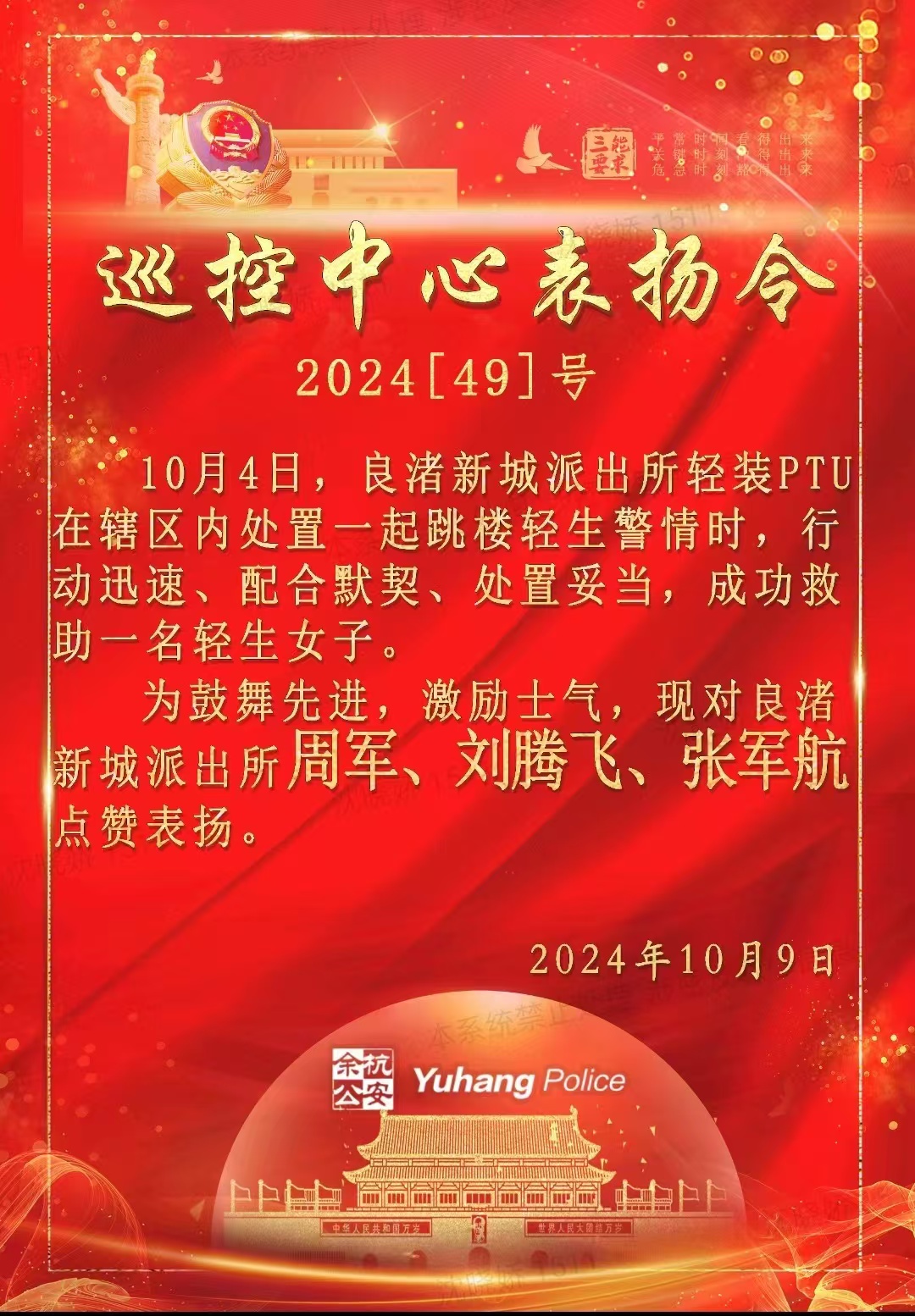 女子后續(xù)交由趕到現(xiàn)場(chǎng)的民警進(jìn)行處理。事后,民泰公司員工劉騰飛和張軍航不顧個(gè)人安危、跨過(guò)頂樓護(hù)欄救下輕生女子的行為得到了余杭區(qū)公安分局巡控中心的通報(bào)表?yè)P(yáng)。