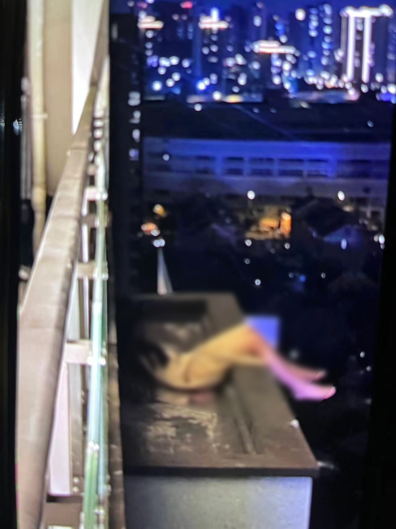 3人快速來(lái)到事發(fā)小區(qū),疾奔到樓頂。此時(shí),該名女子雙腿懸空坐在護(hù)欄外的露臺(tái)處,被小區(qū)保安緊緊地拉著。