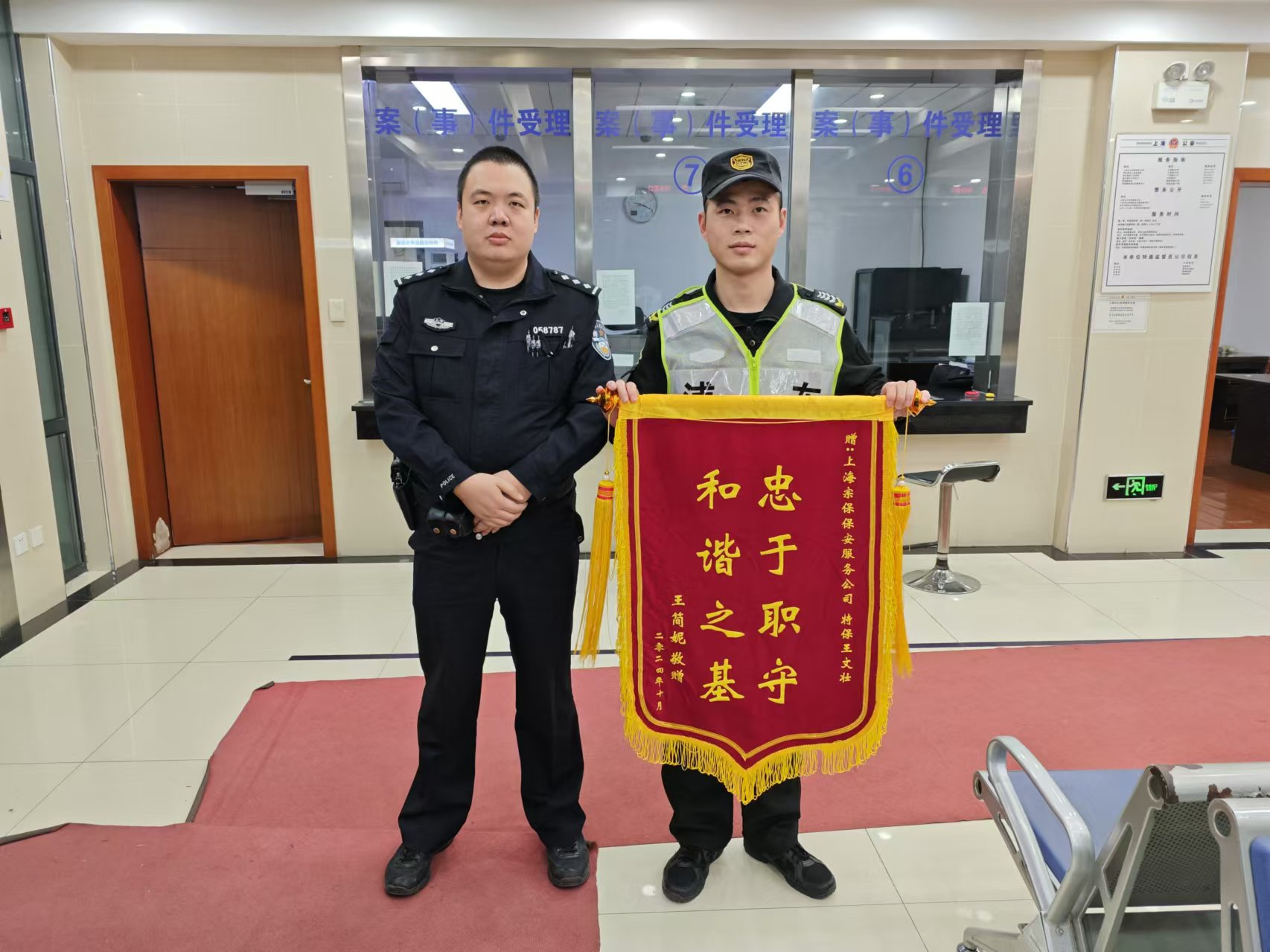 10月27日,宗保公司駐浦東新區(qū)新場(chǎng)派出所輔助項(xiàng)目收到市民王女士贈(zèng)送的一面繡有“忠于職守 和諧之基”的錦旗,感謝公司員工王文壯耐心細(xì)致成功調(diào)解矛盾。