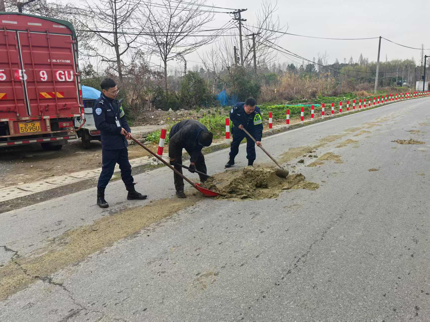 3月5日,浙江民泰公司駐杭州市余杭區(qū)良渚新城派出所輔助項(xiàng)目員工齊心協(xié)力清理路面散落黏土,保障道路通行安全。