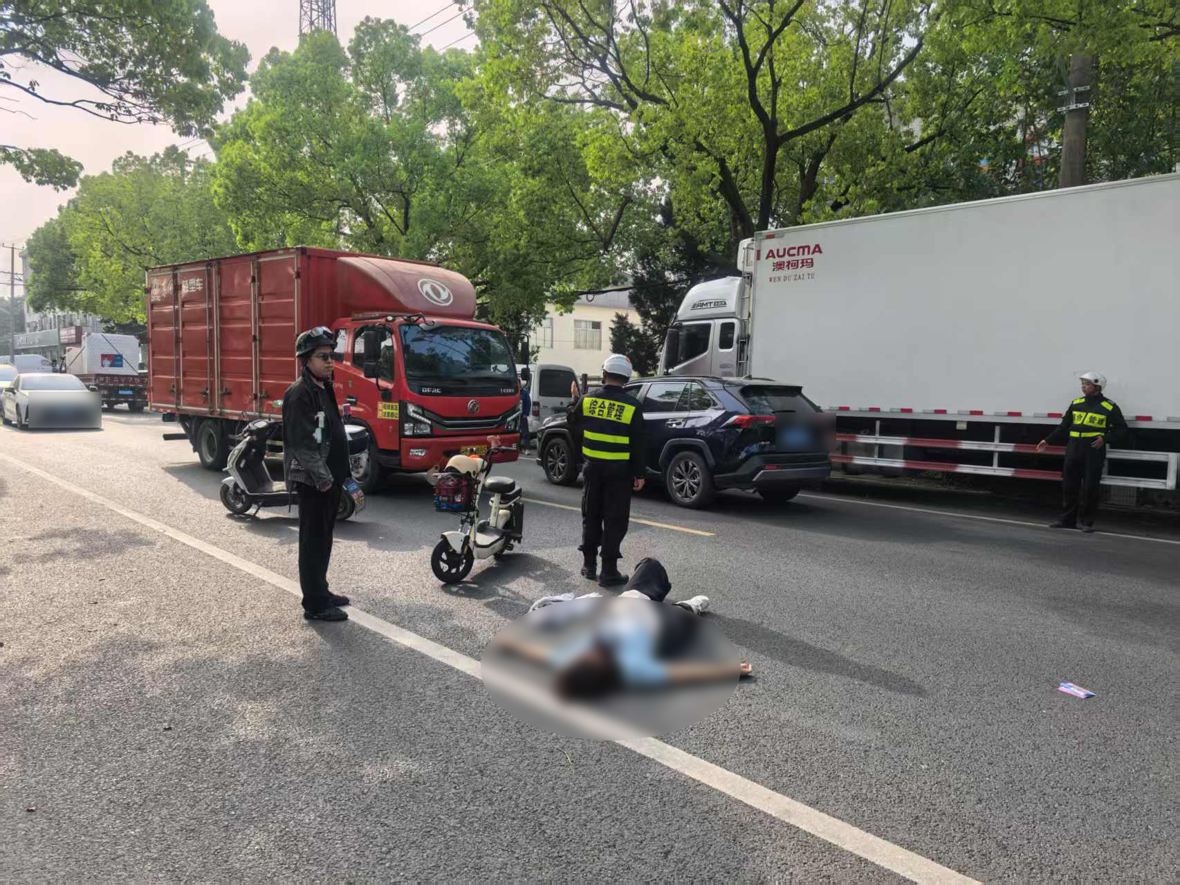 當(dāng)日7時(shí)53分,黃建成和朱智龍?jiān)谥茏9方ㄔO(shè)路巡查時(shí),發(fā)現(xiàn)一名女子騎電瓶車不慎摔倒。由于未佩戴頭盔,女子頭部著地后當(dāng)場失去意識(shí),情況十分危急。面對(duì)突發(fā)狀況,兩人迅速反應(yīng),第一時(shí)間撥打了120急救電話并報(bào)警求助。