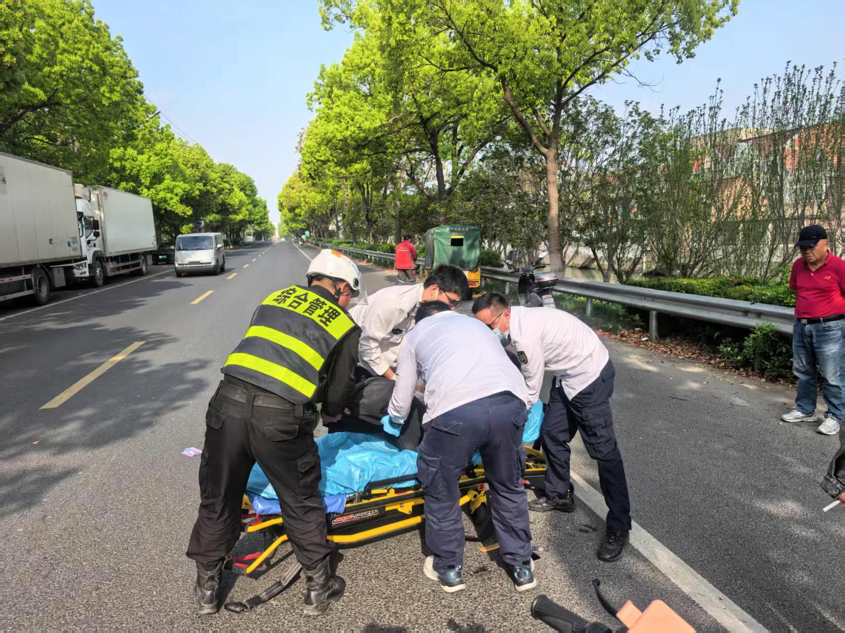 很快,120救護(hù)車抵達(dá)現(xiàn)場。兩人又主動(dòng)協(xié)助醫(yī)護(hù)人員將傷者抬上救護(hù)車,幫助其及時(shí)送往醫(yī)院接受救治。待交警趕到后,黃建成和朱智龍積極配合調(diào)查,詳細(xì)說明了事發(fā)經(jīng)過,展現(xiàn)了高度的社會(huì)責(zé)任感和職業(yè)素養(yǎng)。