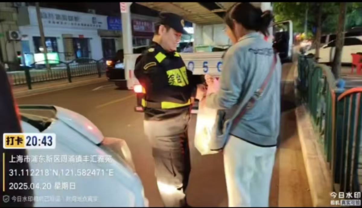 當(dāng)晚20時19分,胡團(tuán)結(jié)和王磊駕車巡查至周市路與祝家港路交叉口時,發(fā)現(xiàn)多名流動攤販占道經(jīng)營,嚴(yán)重影響交通秩序,便立即上前耐心勸導(dǎo)。兩人通過講政策、說道理,最終說服攤販?zhǔn)諗偂H欢粩傌溤陔x開時趁兩人不備,將兩袋水果扔進(jìn)執(zhí)勤車輛后迅速離去。