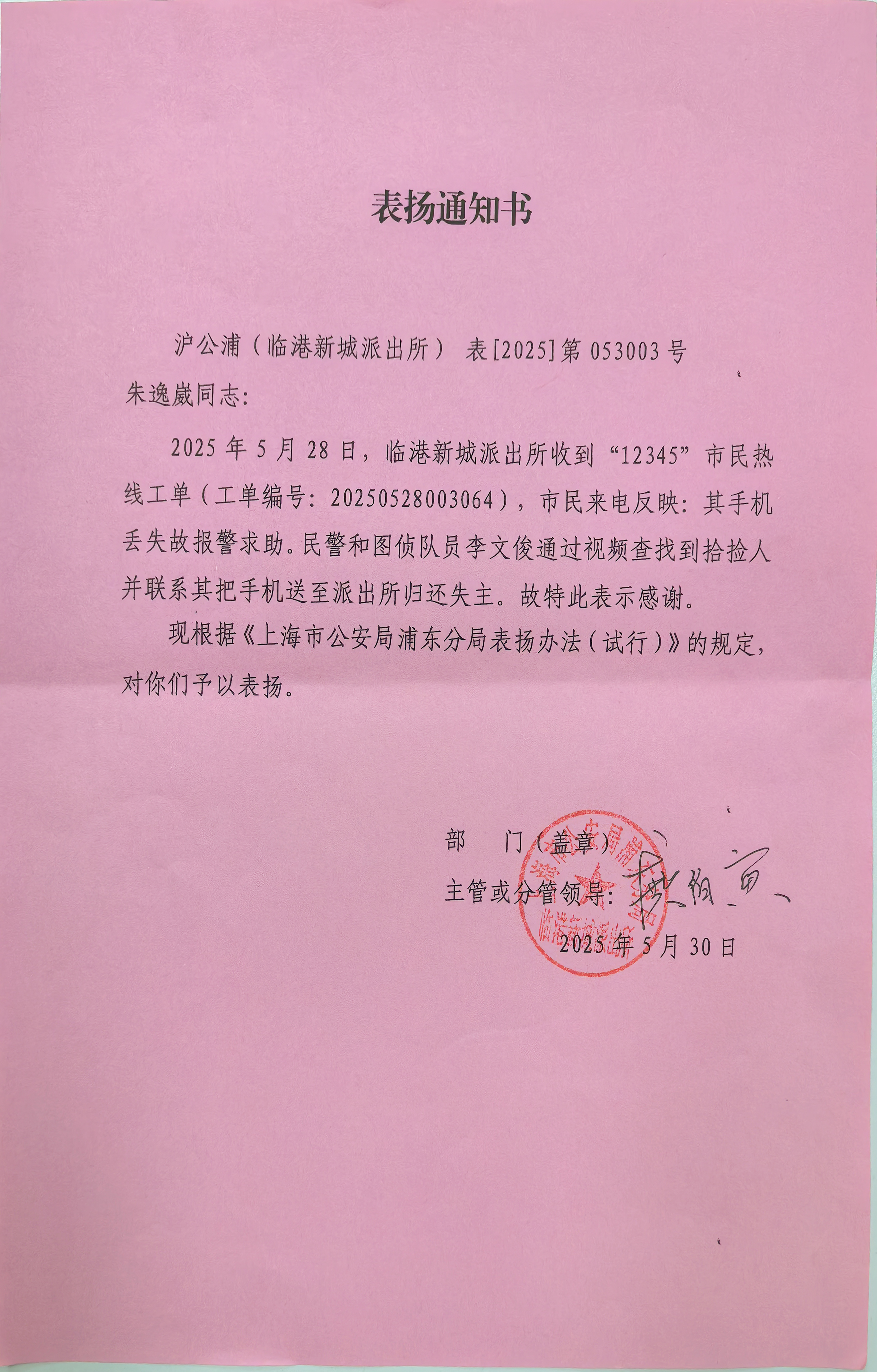 5月28日,找回手機的市民特意致電上海市民熱線12345,點名表揚宗保公司員工李文俊高度的工作責(zé)任心和耐心細致的工作態(tài)度。李文俊的行動充分展現(xiàn)了警務(wù)輔助人員認真負責(zé)、服務(wù)群眾的良好形象,也體現(xiàn)了宗保公司員工良好的職業(yè)素養(yǎng)和責(zé)任擔(dān)當。