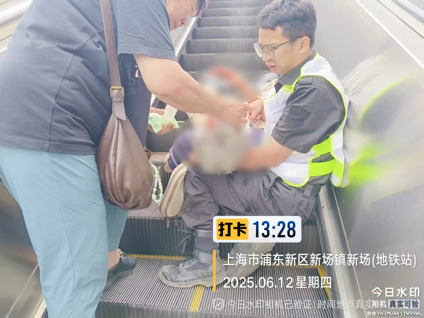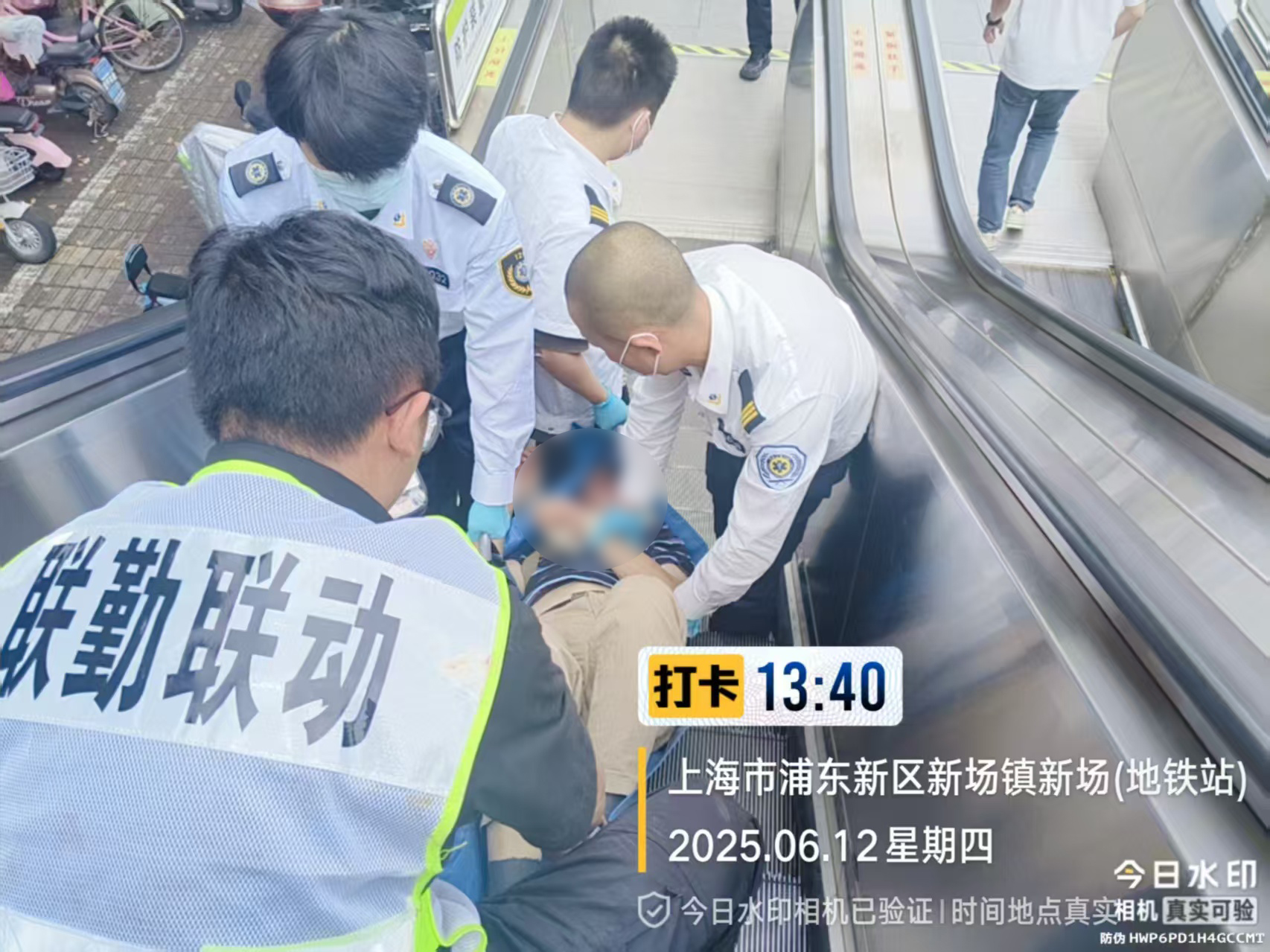 當日13:25,正在16號線新場地鐵站2號口附近巡邏的公司員工翟佳明,突然聽到一陣急促的喊叫聲,來不及多想的他便立即循聲跑去。
