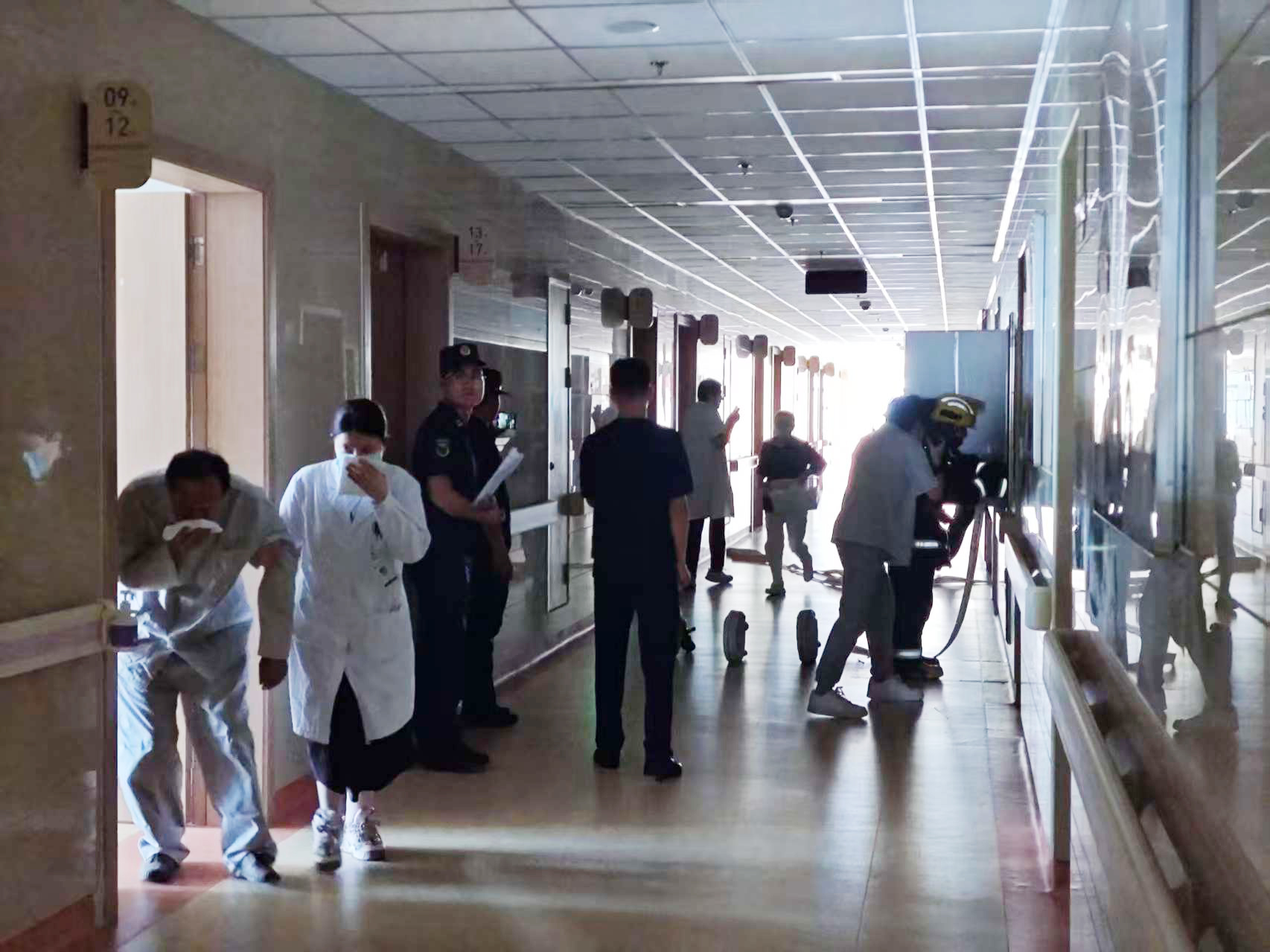 隨后,模擬住院部發(fā)生火情。隨著消防警報響起,公司安保員立刻攜帶滅火器趕赴火情現(xiàn)場展開撲救,并熟練地連接好消防栓水帶,對準起火源進行噴射,有效控制火勢蔓延。與此同時,緊密配合醫(yī)護人員,引導醫(yī)患人員彎腰低姿、濕毛巾捂口鼻撤離,使用擔架、輪椅將行動不便的患者安全疏散至廣場。
