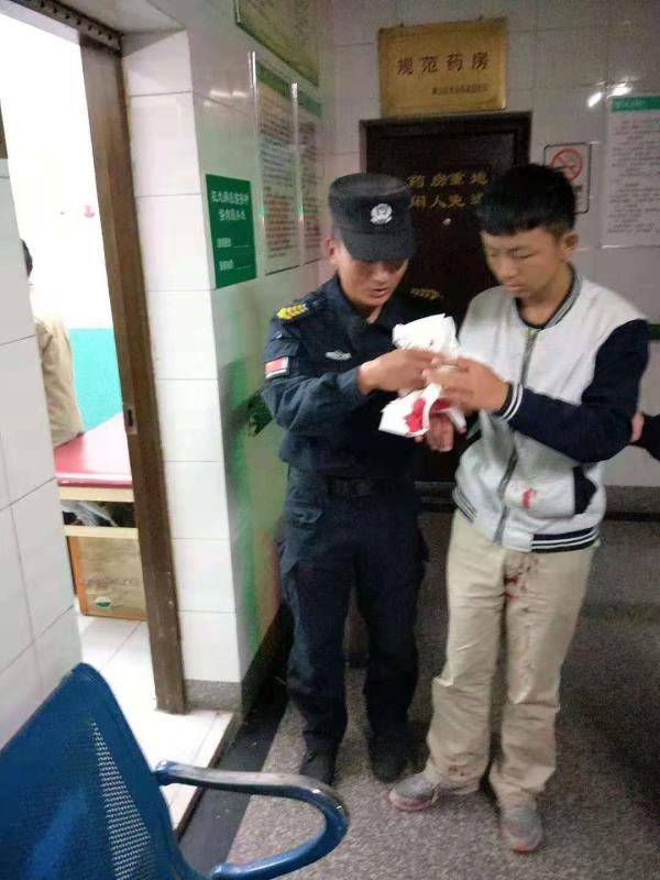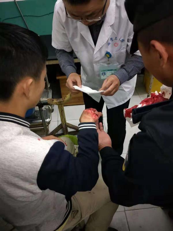 當(dāng)天18:30分,黃山二中九年級(jí)六班學(xué)生王洋在宿舍樓下玻璃門上做引體向上,不小心把手碰在玻璃上,嚴(yán)重受傷,血流滿地。因失血過多加上驚嚇,王洋嘴唇發(fā)白,身體站不穩(wěn)。 此時(shí)正在附近訓(xùn)練的宗保特保隊(duì)員得知消息后,第一時(shí)間趕到學(xué)校,把王洋送到最近的甘棠醫(yī)院治療,同時(shí)與學(xué)校老師取得聯(lián)系。因傷勢(shì)嚴(yán)重,王洋被甘棠醫(yī)院拒收,后又不得不送到龍井醫(yī)院。期間,李鵬程等宗保特保隊(duì)員一路狂奔,送醫(yī)院、轉(zhuǎn)醫(yī)院、掛號(hào)、找醫(yī)生,全程陪護(hù)學(xué)生做完一系列的檢查。經(jīng)過緊急救治,該學(xué)生已無大礙。