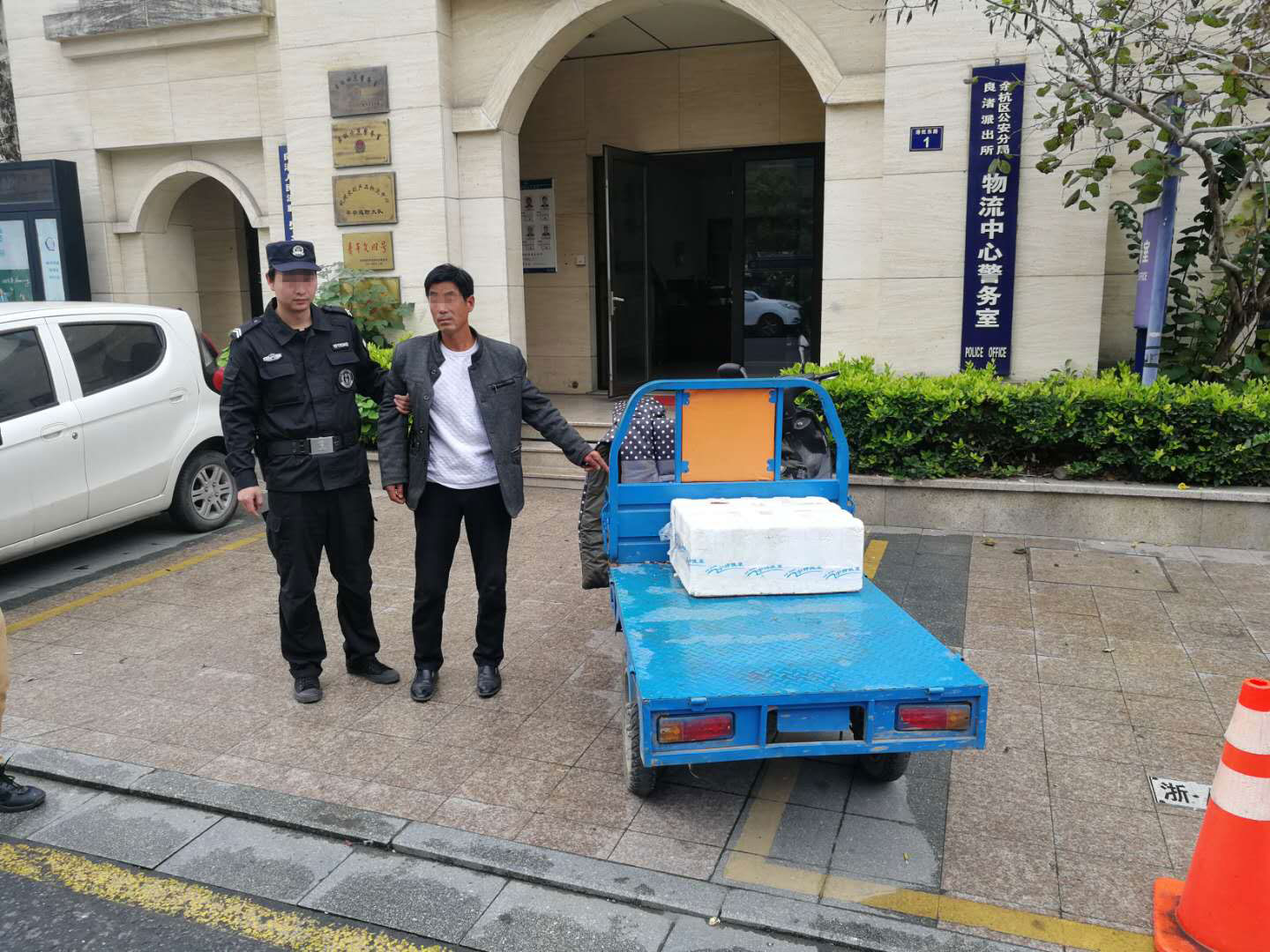 我們隊(duì)員隨即跟隨民警來到嫌疑人出現(xiàn)的羊肉館,對嫌疑人當(dāng)場進(jìn)行了控制及抓捕,后將其帶至物流警務(wù)室等待民警進(jìn)行審問。審問期間,嫌疑人對在物流片區(qū)盜竊電瓶供認(rèn)不諱。審訊完畢,我們隊(duì)員還協(xié)助民警將嫌疑人押送至良渚派出所。
