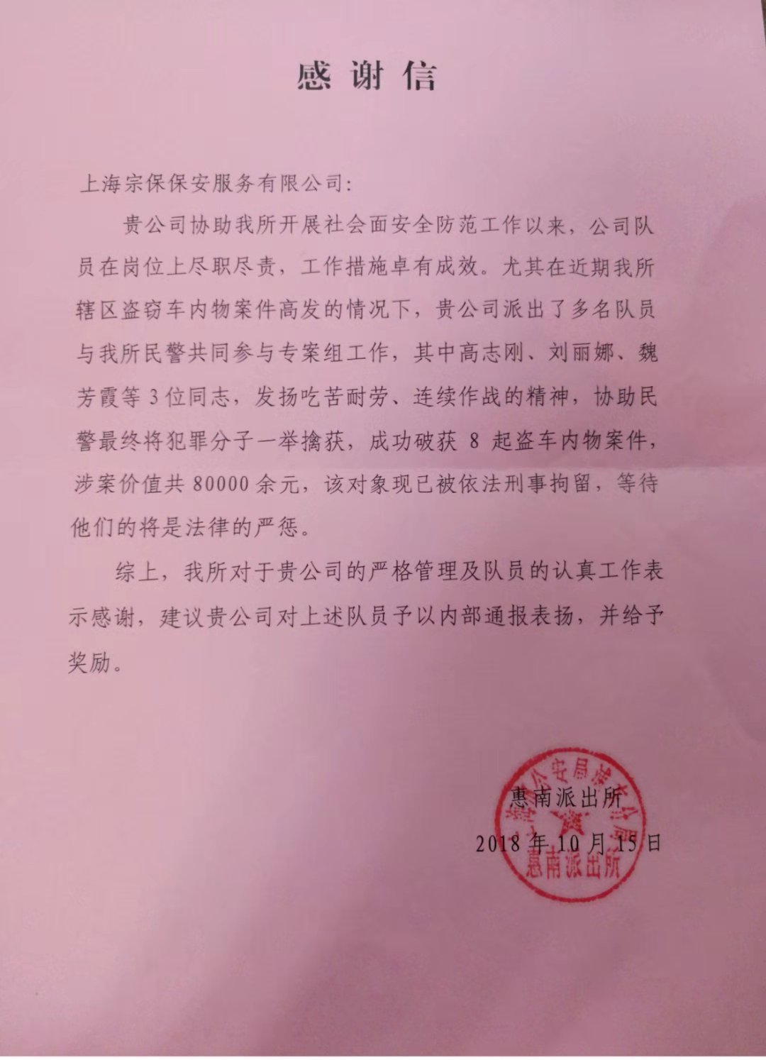 惠南派出所對宗保公司的嚴(yán)格管理及對他們工作上的大力支持深表感謝,對隊員們的認(rèn)真工作表示認(rèn)可及贊揚(yáng)。事后惠南派出所還特意向宗保公司寫來了感謝信。