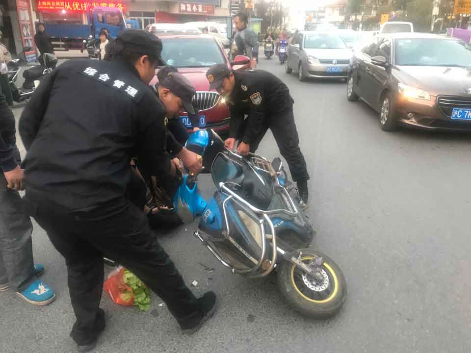 當(dāng)天下午16:00左右,黃路社區(qū)隊員秦泗彬、湯紅強(qiáng)、朱清科、劉偉、陶永錦等在上班巡邏期間,發(fā)現(xiàn)在川南奉公路振興路路口10米處發(fā)生一起轎車與電瓶刮撞事故,該事故造成道路封堵。正是下班高峰期,五名隊員立馬下車幫助當(dāng)事人報警,并勸導(dǎo)兩名當(dāng)事人拍好照片,取好證,讓當(dāng)事人車輛??柯愤?。接下來,五名隊員指引擁堵車輛有序通行,使交通慢慢恢復(fù)暢通。
