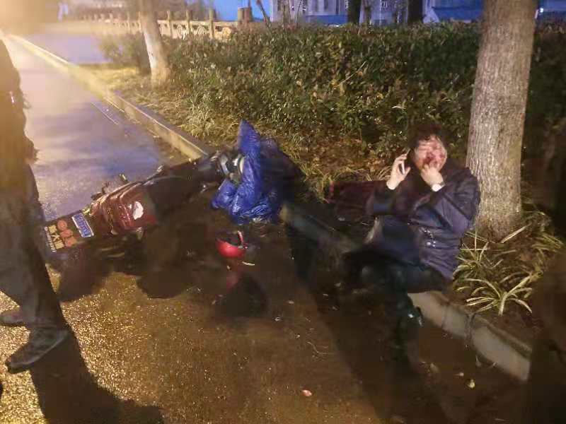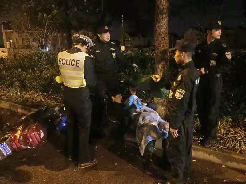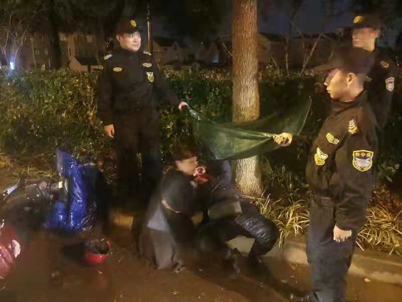 當天下午17:00左右,王飛,劉兵,周支鴻,張亮亮,馬勇飛等隊員在下班途中,經(jīng)南團公路到達東四灶港橋附近時,發(fā)現(xiàn)路邊綠化帶上一行人連同電瓶車倒在地上。隊員們立即停車下去查看,發(fā)現(xiàn)是一位老太太,因雨天路滑騎車摔倒在地上。當時其嘴部鮮血較多,語言表達不清。根據(jù)當時情況,隊員第一時間撥打了110和120急救電話,然后上前與老人一番溝通,最終通過老人的手機與其家人取得了聯(lián)系。在等待救援和家人的過程中,老人躺在地上哭泣。因天氣一直下著小雨,隊員拿來雨衣?lián)卧诶先松砩蠟槠鋼跤?,守護在老人身邊,直至警察、急救人員、家屬到現(xiàn)場后,合力將老人送到救護車上。