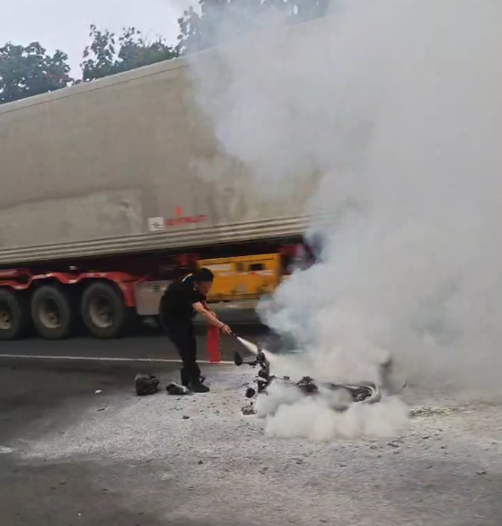 面對(duì)突發(fā)情況,李風(fēng)雷第一時(shí)間向監(jiān)控室及當(dāng)班負(fù)責(zé)人報(bào)告,并呼叫附近同事支援。同事王海全和來成飛接到通知后,迅速攜帶滅火器等應(yīng)急裝備趕到現(xiàn)場(chǎng)。三人默契配合、分工明確:李風(fēng)雷迅速將受傷駕駛員轉(zhuǎn)移至安全區(qū)域;王海全負(fù)責(zé)疏導(dǎo)交通,指揮過往車輛有序繞行;來成飛則使用滅火器對(duì)準(zhǔn)火源根部進(jìn)行持續(xù)噴射。在大家的共同努力下,明火在幾分鐘內(nèi)被徹底撲滅。