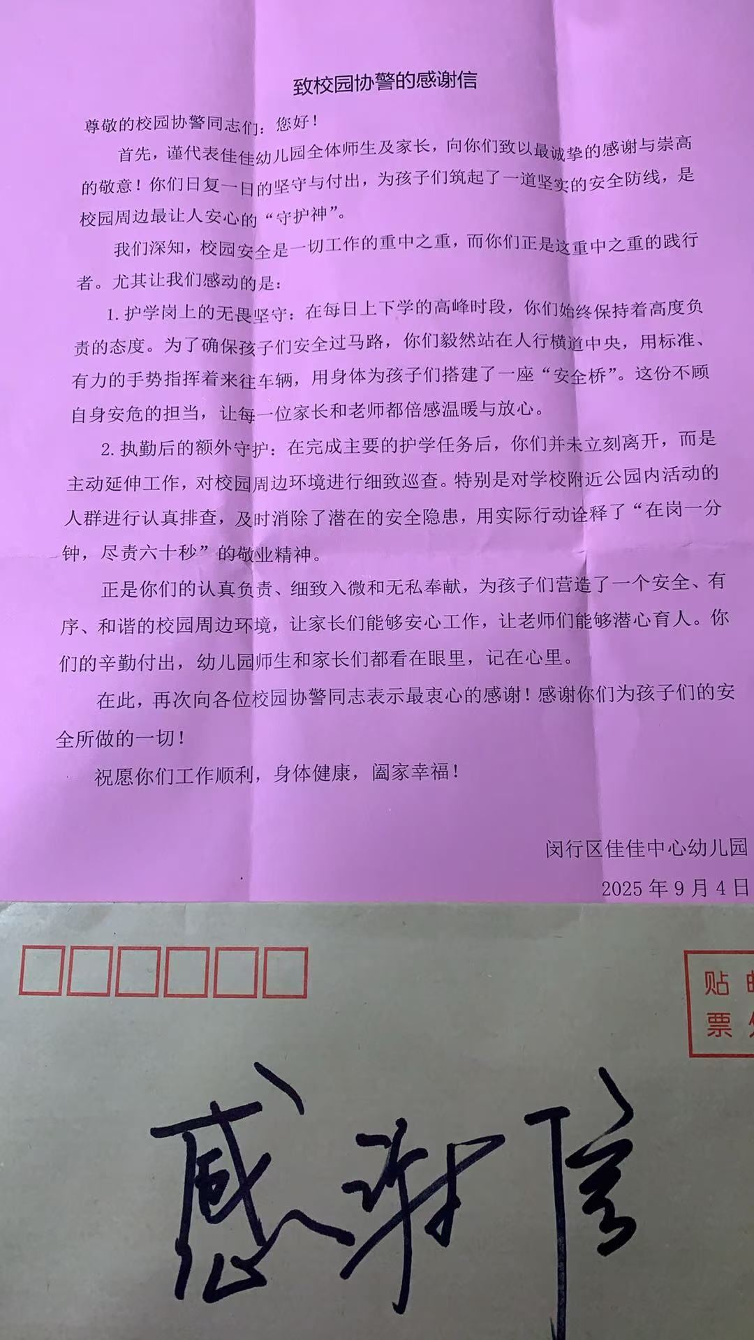 中心幼兒園感謝公司員工們?cè)谧o(hù)校期間盡職盡責(zé)、任勞任怨的辛勤付出,贊揚(yáng)員工們圓滿(mǎn)完成護(hù)校任務(wù),主動(dòng)提供暖心護(hù)航,所展現(xiàn)出的良好職業(yè)素養(yǎng)和服務(wù)意識(shí)。