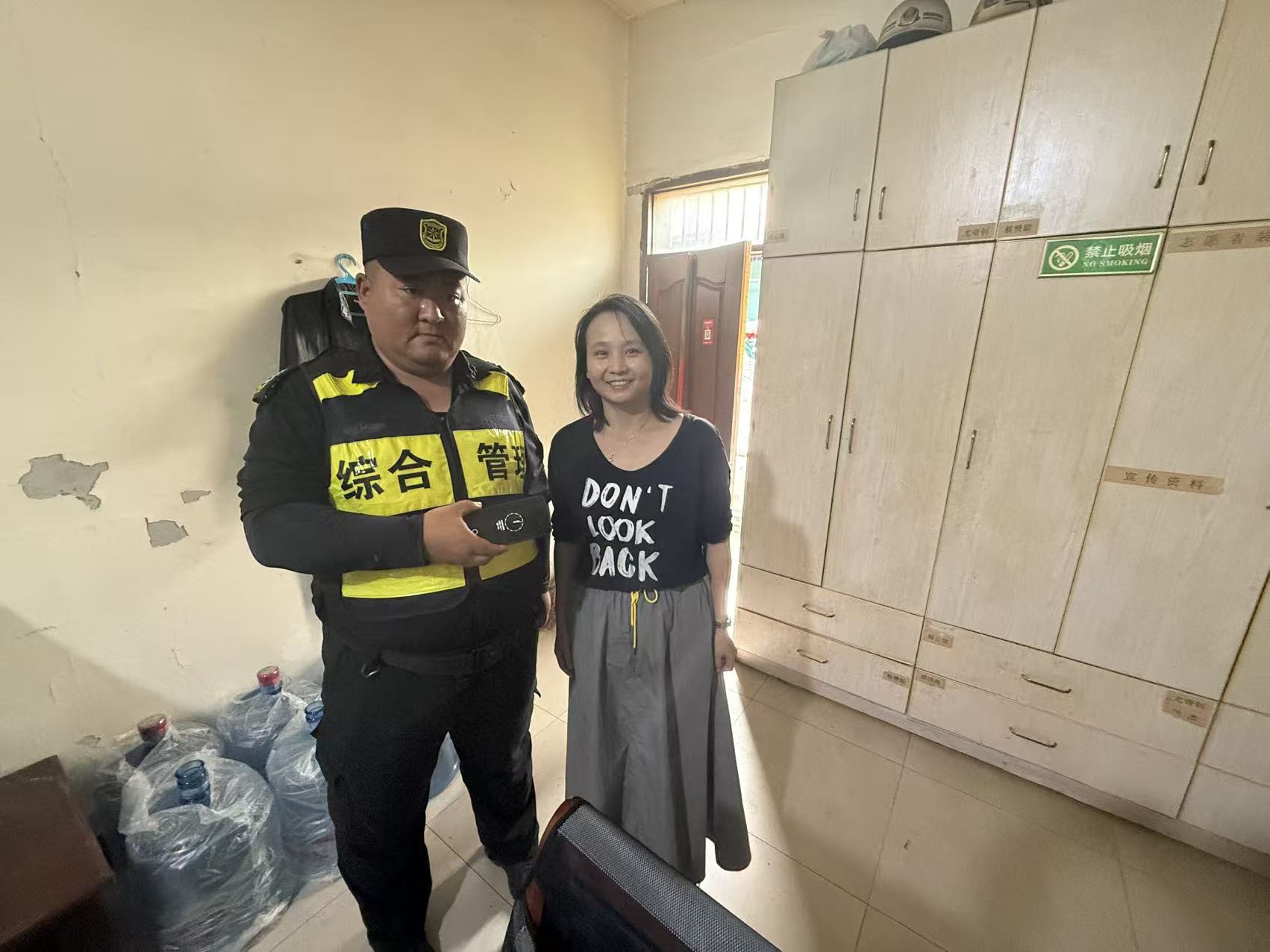 很快,一位身穿藍色防曬衣的女士趕到現(xiàn)場。韋日成通過女士指紋解鎖手機,確認其是失主后,就把手機歸還給了她。女士拿到手機非常高興,連連稱贊宗保員工拾金不昧的助人行為。