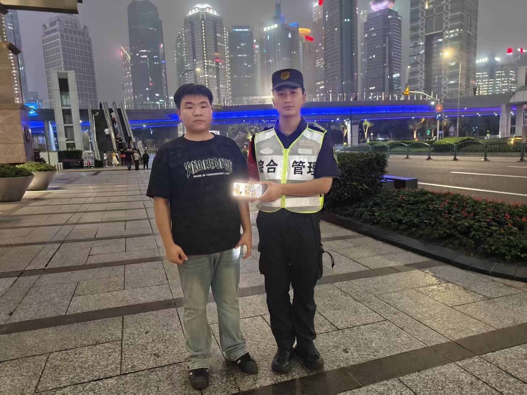 10月15日21:00,宗保公司駐浦東新區(qū)陸家嘴綜合管理項目員工李永田在金茂大廈附近巡邏時,撿到一部華為手機??紤]到失主可能會返回尋找,李永田便在原地等待。