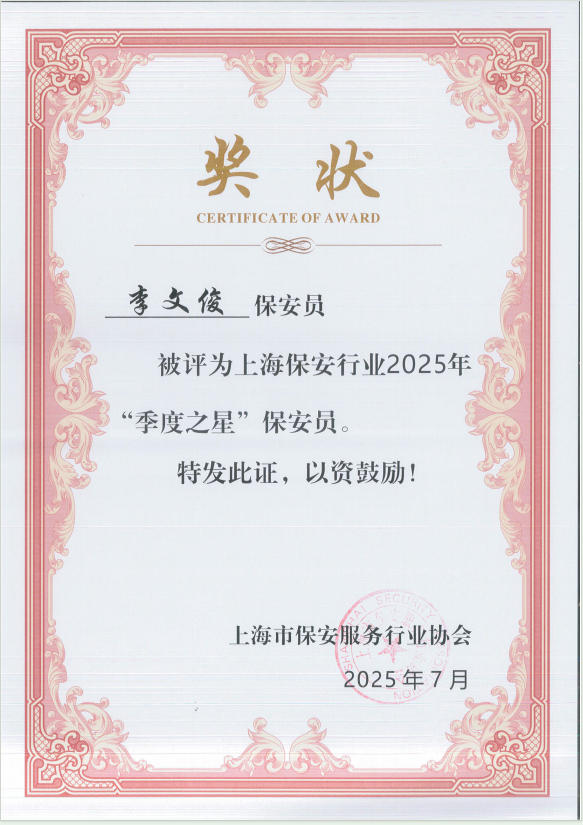 近日,上海市保安服務行業(yè)協(xié)會公布了上海保安行業(yè)2025年第二季度優(yōu)秀保安隊、保安員展示名單,宗保公司1個項目保安隊和3名員工個人獲此殊榮。