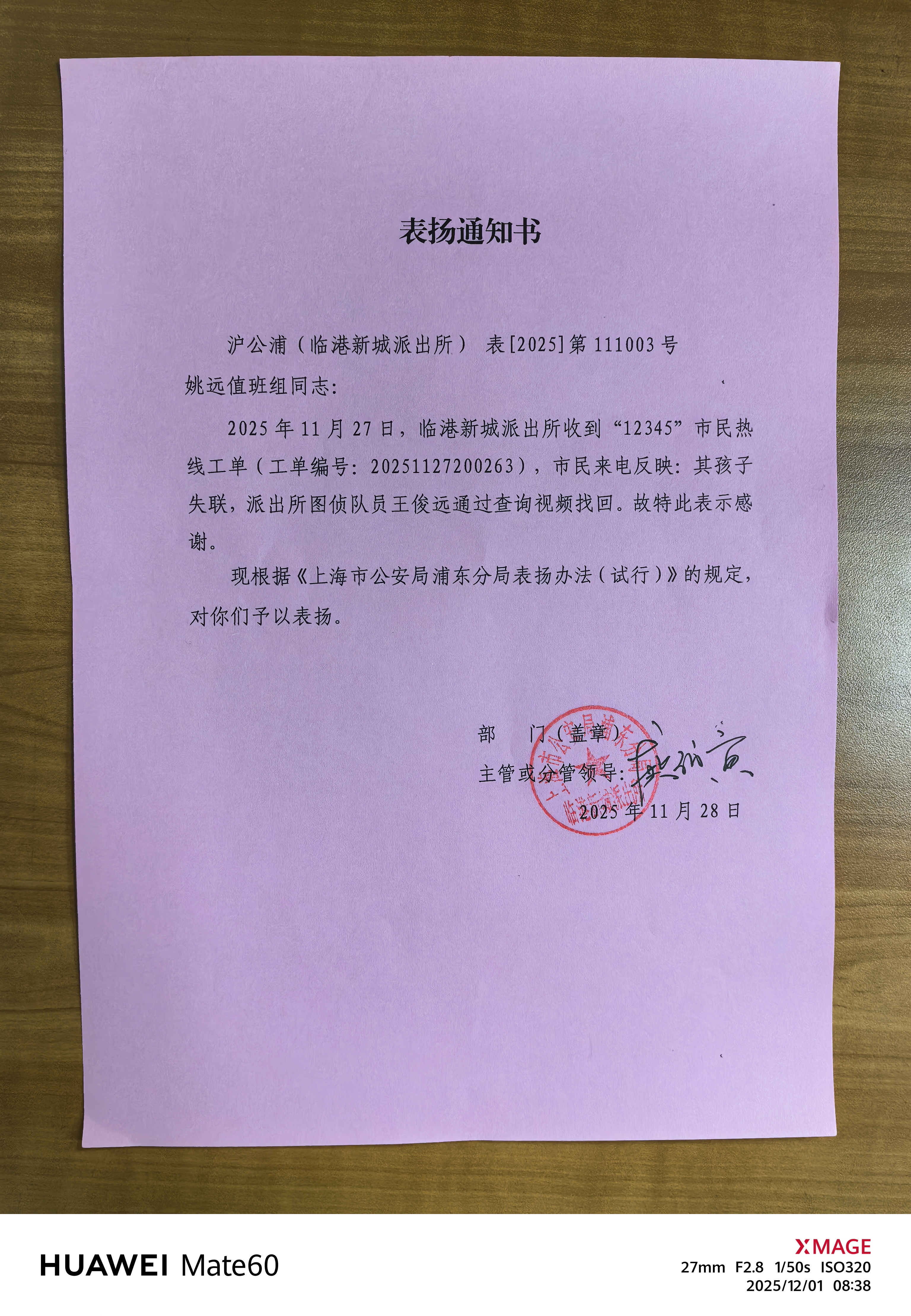 11月26日,宗保公司駐浦東新區(qū)臨港新城派出所輔助項目員工王俊遠協(xié)助民警幫助報警人喬女士找到失聯(lián)兒子,受到喬女士致電上海政務服務便民熱線12345點名贊揚。
