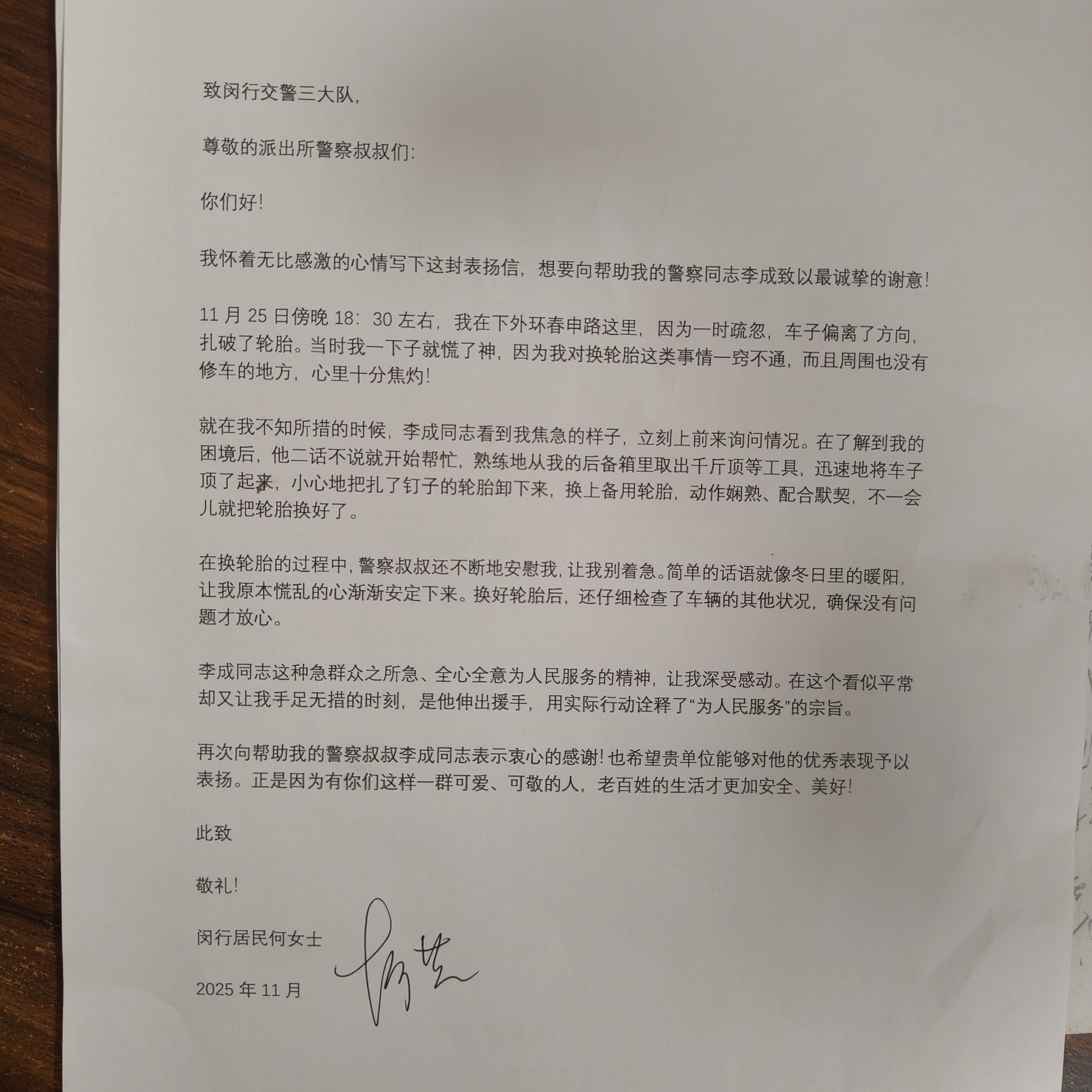 輪胎更換完畢后,李成又仔細檢查了車輛輪胎氣壓及其他關鍵部位,確認車輛無安全隱患后,才放心讓何女士駕車離開。事后,何女士為表示感謝,特意送來一面錦旗表達謝意。
