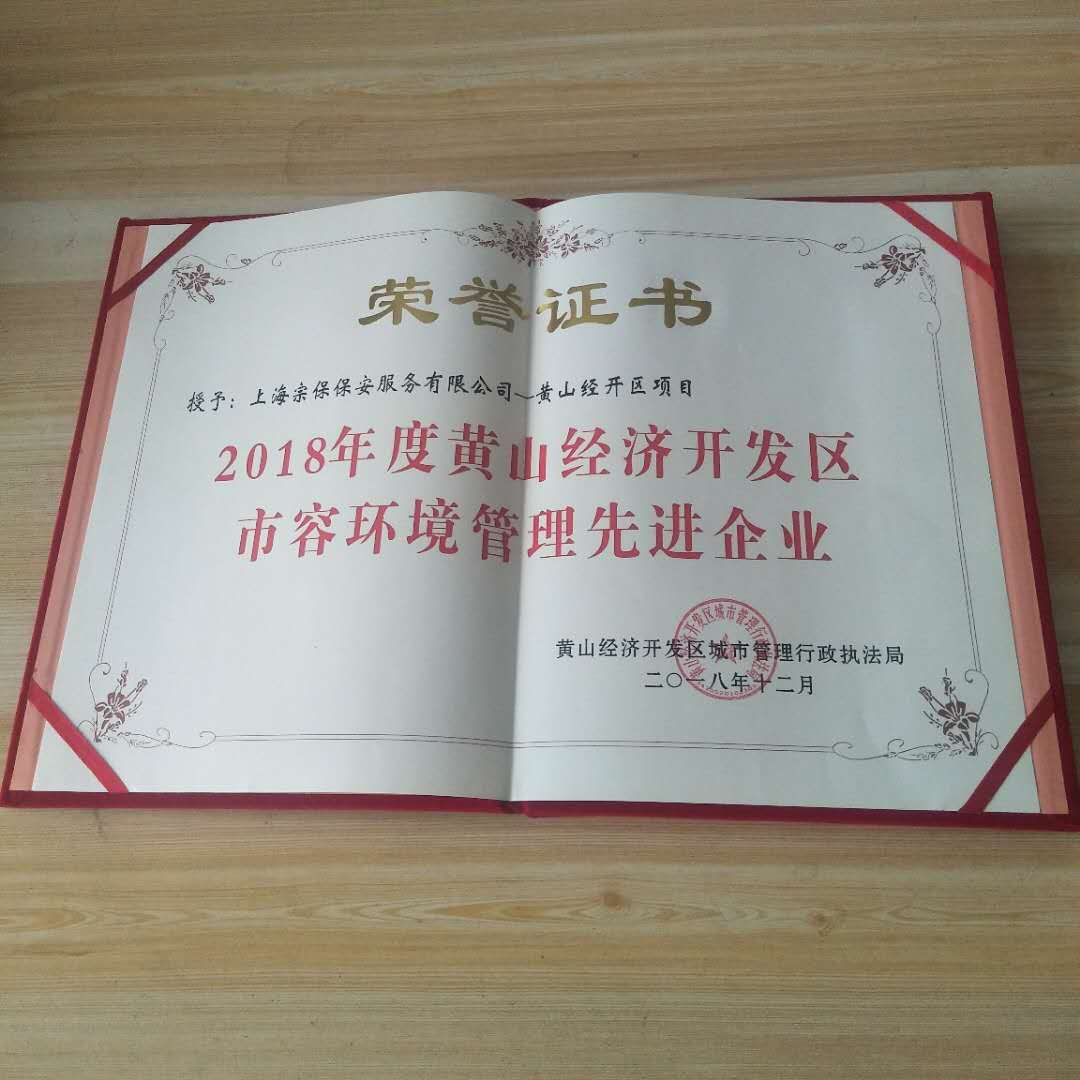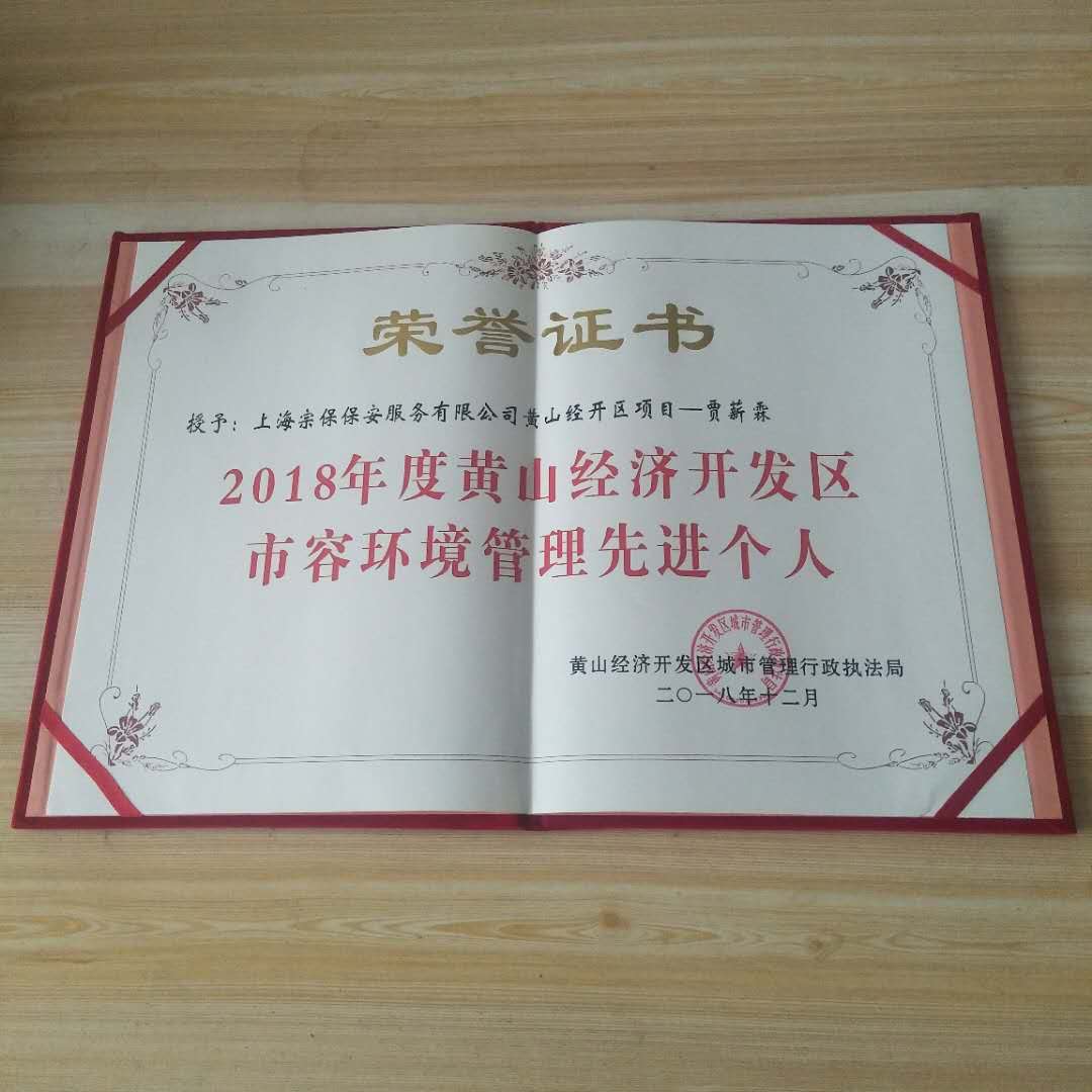 2019年2月2日,黃山經(jīng)濟(jì)開發(fā)區(qū)城市管理行政執(zhí)法局劉局長(zhǎng),為上海宗保頒發(fā)“2018年度黃山經(jīng)濟(jì)開發(fā)區(qū)市容環(huán)境管理先進(jìn)企業(yè)”及“2018年度黃山經(jīng)濟(jì)開發(fā)區(qū)市容管理先進(jìn)個(gè)人”榮譽(yù)證書