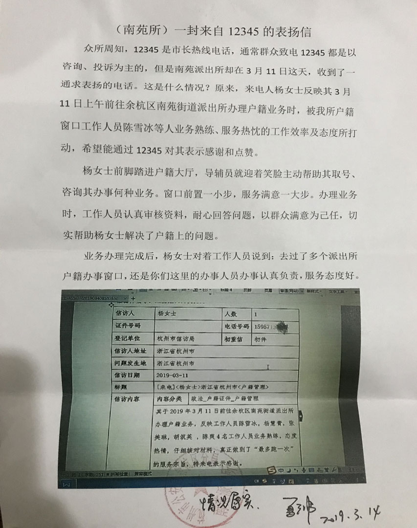 2019年3月14日,浙江民泰南苑輔警項(xiàng)目收到一封來(lái)自12345專(zhuān)線的表?yè)P(yáng)信,對(duì)余杭南苑街道派出所工作人員及宗保戶籍室隊(duì)員陳爽工作認(rèn)真、業(yè)務(wù)熟練、貼心服務(wù)表示感謝。