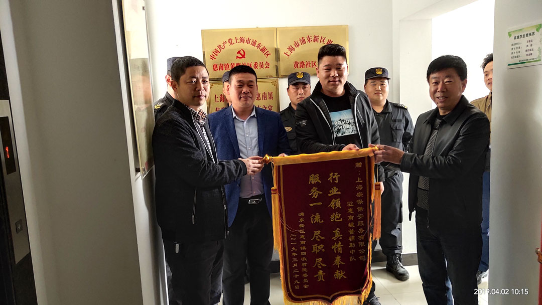 2019年4月2日,上?;菽湘?zhèn)四墩村朱書記、姚主任將一面繡有“行業(yè)領(lǐng)跑,真情奉獻(xiàn),服務(wù)一流,盡職盡責(zé)”的錦旗送到宗?;菽蠀^(qū)域經(jīng)理王鳳樓、市容隊(duì)長(zhǎng)王華奇的手中,對(duì)宗保駐惠南輔助隊(duì)伍在“美麗庭院”專項(xiàng)整治過(guò)程中的工作,給予了充分的肯定。