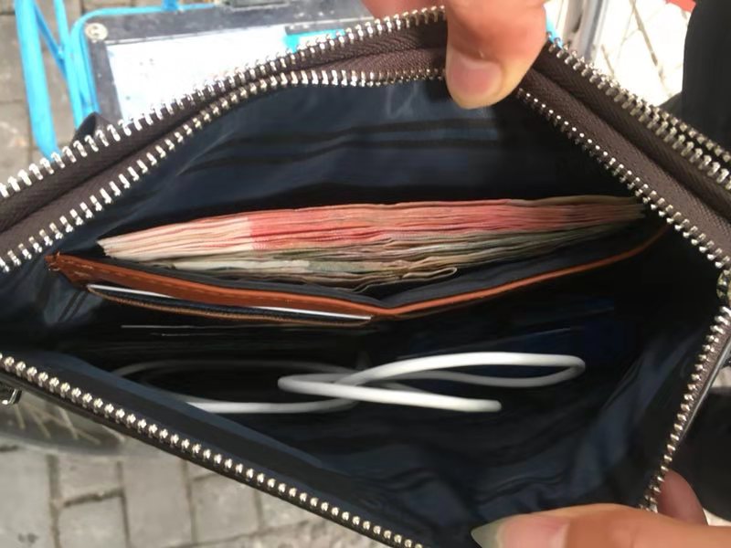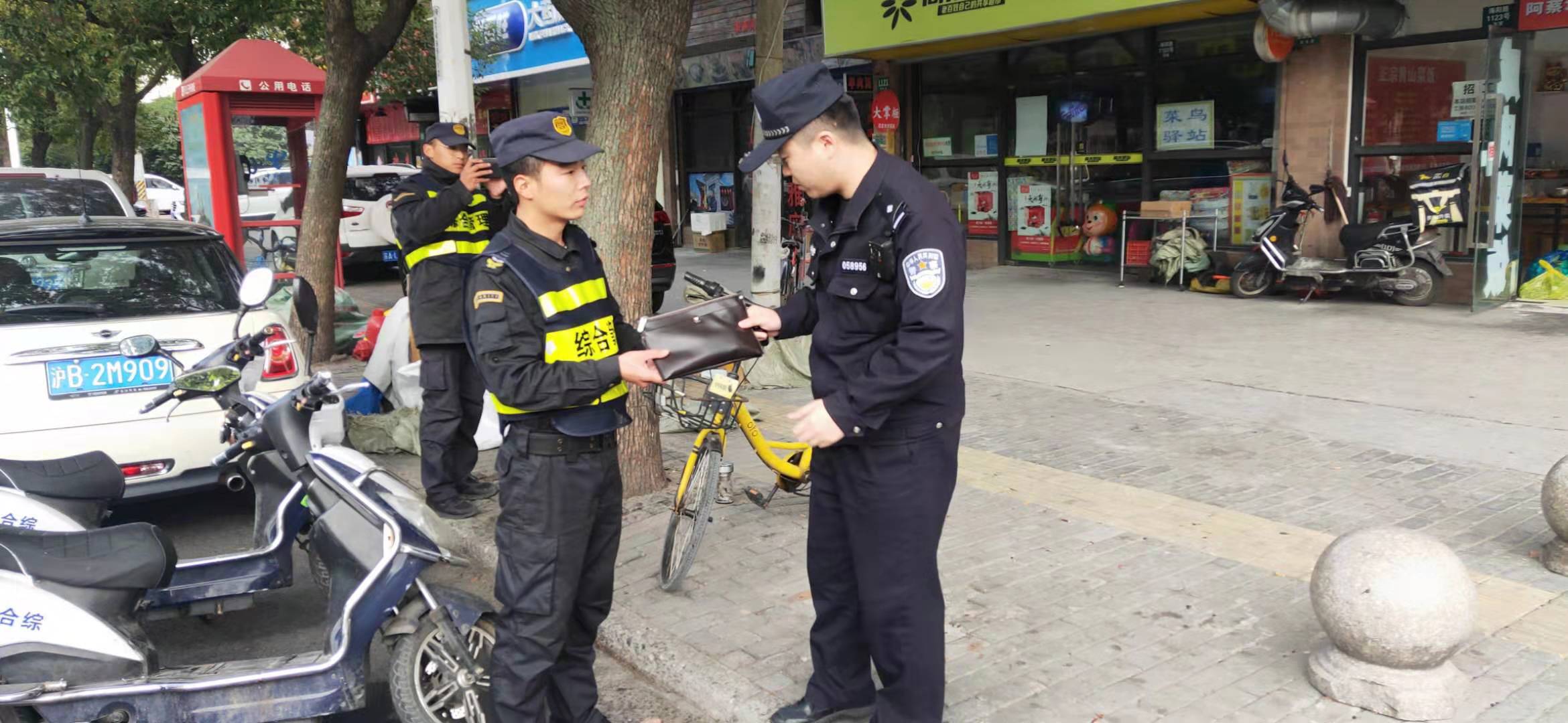 帶班組長隨即上報項目負責(zé)人,并調(diào)派在崗隊員前往現(xiàn)場。在所有隊員和現(xiàn)場群眾的見證下,對包內(nèi)物品進行了清點,內(nèi)有現(xiàn)金2263.9元、充電器、銀行卡以及身份證、駕駛證等證件。隨后,帶班組長撥打報警電話,民警到達現(xiàn)場后,隊員將錢包及物品悉數(shù)移交給民警。考慮到失主可能返回尋找的急切心情,帶班組長一邊安排隊員留守現(xiàn)場等待失主,一邊告知周邊商戶如果有人尋找可到楊思派出所認領(lǐng)。