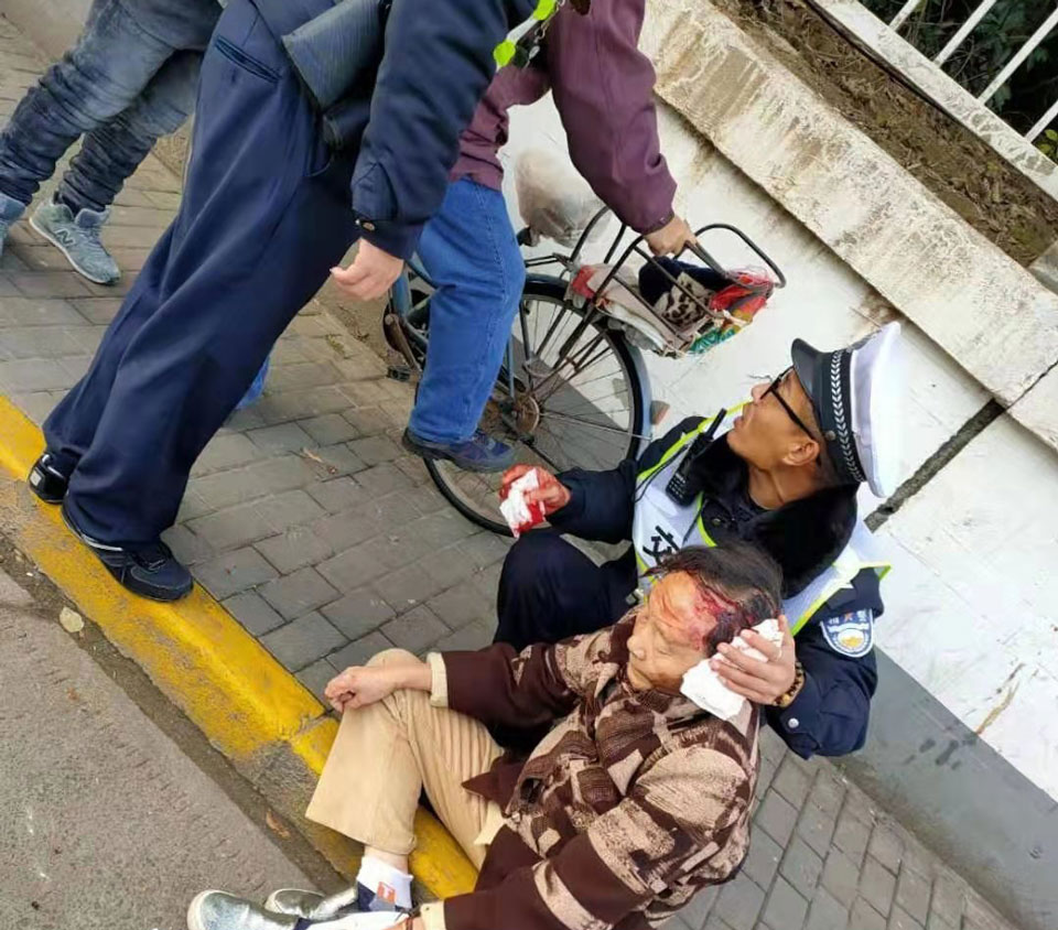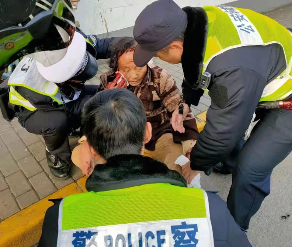 當(dāng)天上午9:25,小鄭在滬閔路蓮花崗值勤時(shí),看到一位老人騎車摔倒,就急忙跑過(guò)去,老人頭部受傷,血流不止。小鄭一方面報(bào)告值班民警,另一方面聯(lián)系120急救車。
