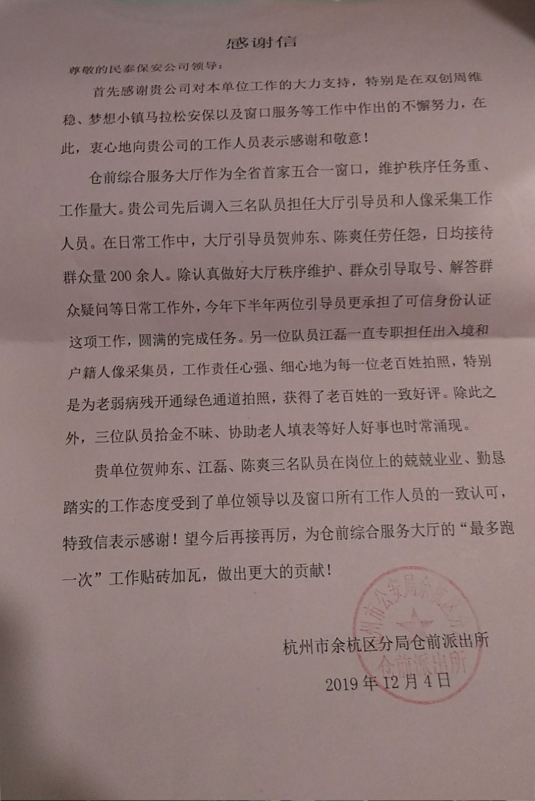 12月4日,倉(cāng)前派出所送來(lái)表?yè)P(yáng)信,對(duì)浙江民泰駐該所輔警項(xiàng)目的賀帥東、陳爽、江磊等3名隊(duì)員點(diǎn)名表?yè)P(yáng)。